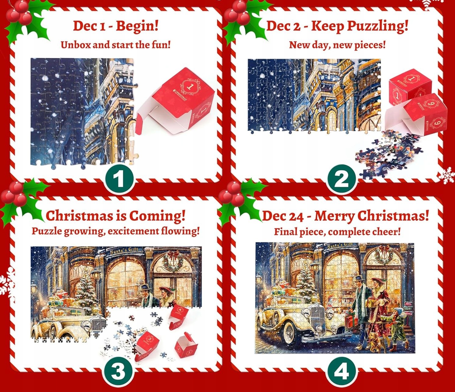 - [Зворотний відлік]: цей Адвент-календар на 2025 рік призначений для дорослих і дітей, він містить 24 пронумеровані коробки, які можна відкрити у відповідний день, кожна з яких містить 42 частини пазла, які складають 1008 частин головоломка. Кожна коробка відповідає одному дню між 1 і 24 грудня, тож ви можете відраховувати до Різдва, заповнюючи одну частину головоломки щодня. Одна коробка — це одна частина пазла, через 24 дні вам потрібно буде з’єднати весь пазл, у набір входить дошка — плакат із зображенням, яке потрібно скласти.
