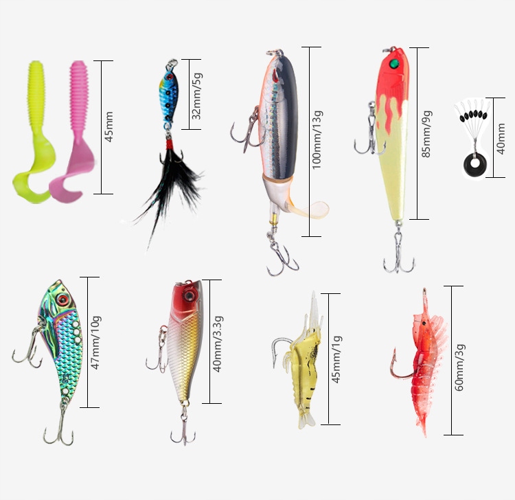 Рибальський набір підходить для всіх видів хижої риби. Набір з 24 рибальських приманок і аксесуарів. У набір входять різні види приманок, такі як жорсткі приманки, м'які приманки і т.д. Приманки імітують рух риби, тим самим залучаючи хижу рибу.
