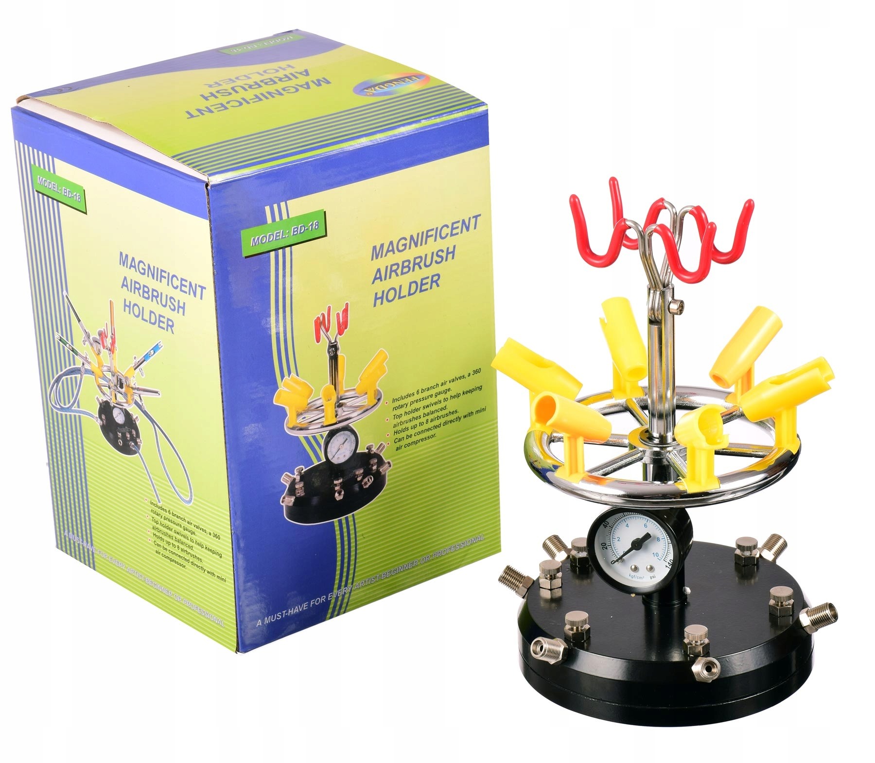Професійна підставка для аерографа, виготовлена з високоякісного металу та пластику. Він призначений як для аерографів з верхнім і низьким водоймою. Він має манометр для контролю регуляторів тиску та тиску на кожному з шести з'єднань.