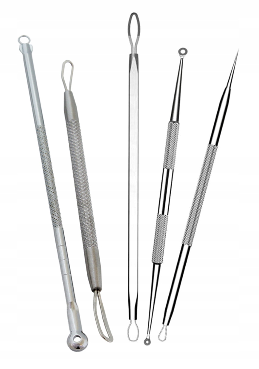 Набір з 5 чайних ложок для безпечного видалення чорних крапок, вугрів і прищів! Професійні ложечки-петлі призначені для роботи з чорними крапками та іншими забрудненнями на обличчі. Вони ідеально підходять для видалення прищів у важкодоступних місцях!