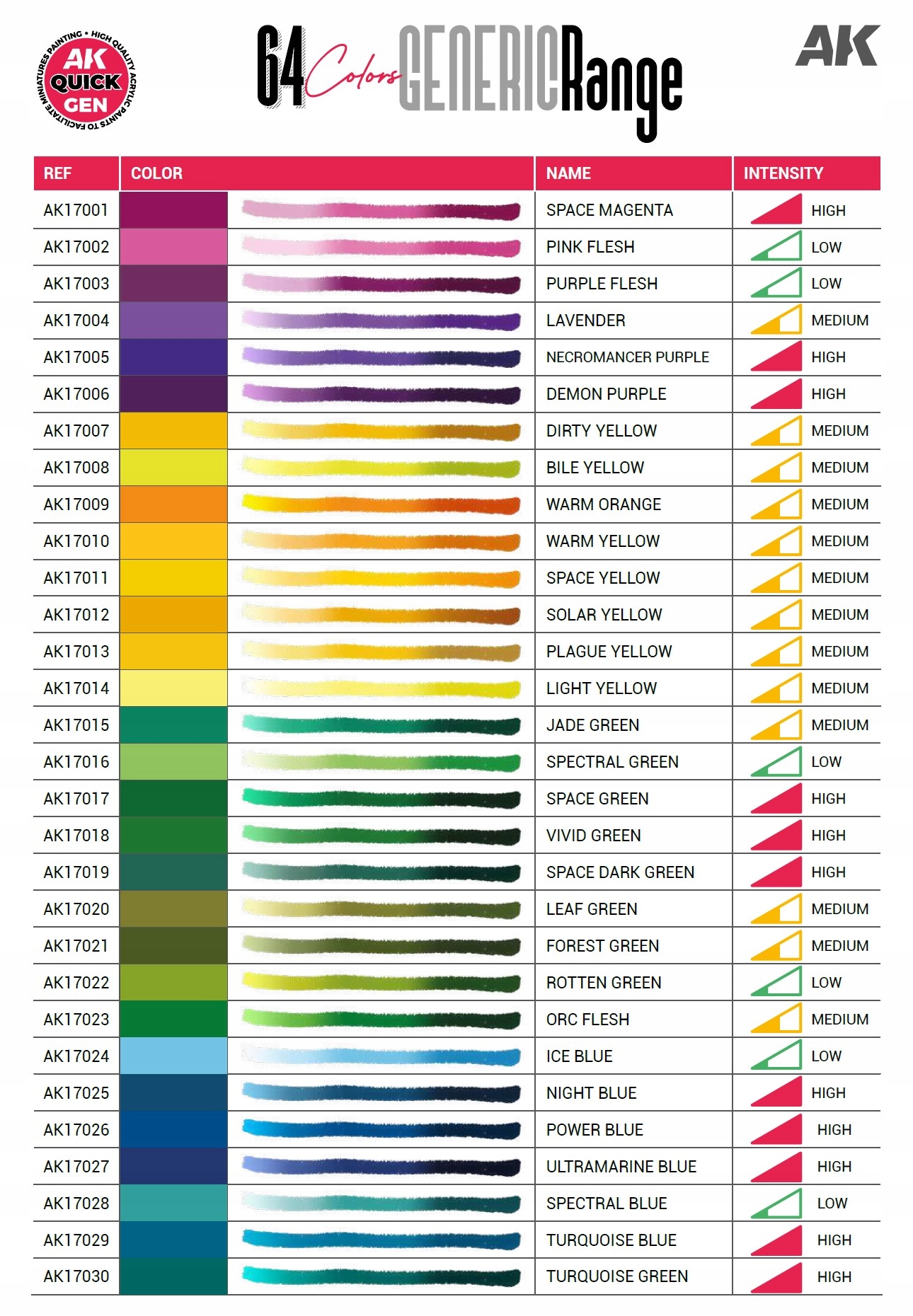Завдяки інноваційній формулі, заснованій на смолі нового покоління, ці фарби дозволяють отримати вплив Chiaroscuro ( контраст ) на один шар, що значно скорочує час роботи на фігурках - без компромісів у якості. Є 80 кольорів - 64 основні кольори, 6 металевих відтінків, 9 військових кольорів з Другої світової війни для бойових ігор та Quck Gen Medium.