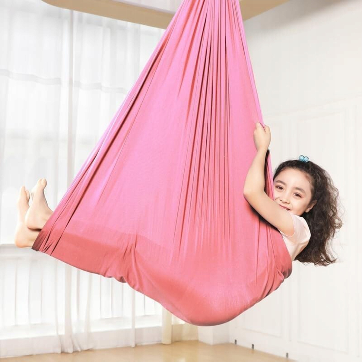 Дитячий гамак-гойдалка виготовлений зі 100% нейлону високої щільності, що робить його легким і стійким до розривів, і має вантажопідйомність до 90 кг (200 фунтів). Надзвичайно м’яка конструкція, що розтягується з боків і не перекочується, полегшує та безпечніше для дітей, щоб грати та відпочивати, коли їм потрібно зняти стрес. Лікувальна гойдалка з тканинною кімнатною гойдалкою дає дітям багато можливостей грати на гойдалках, читати, робити сальто та обертатися.