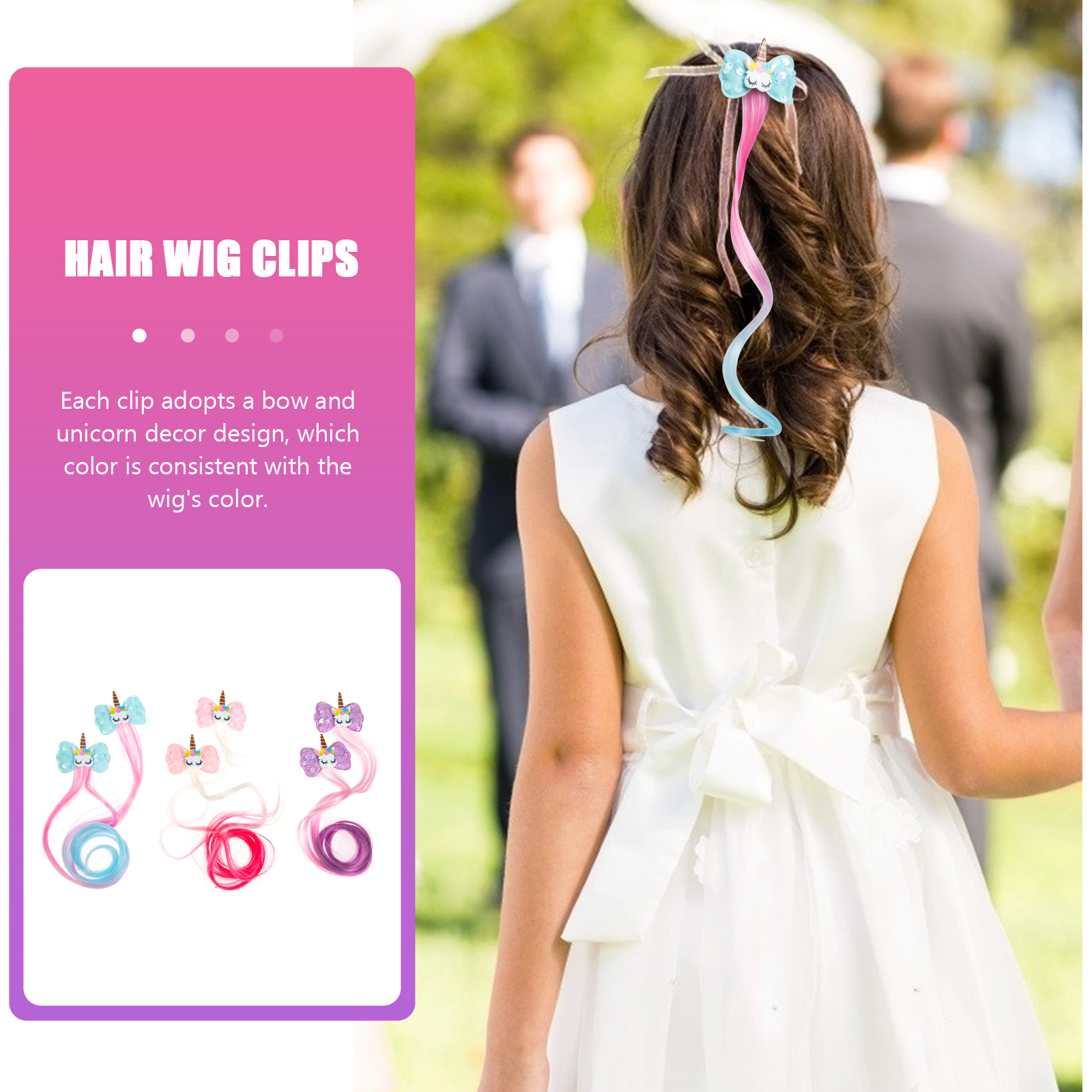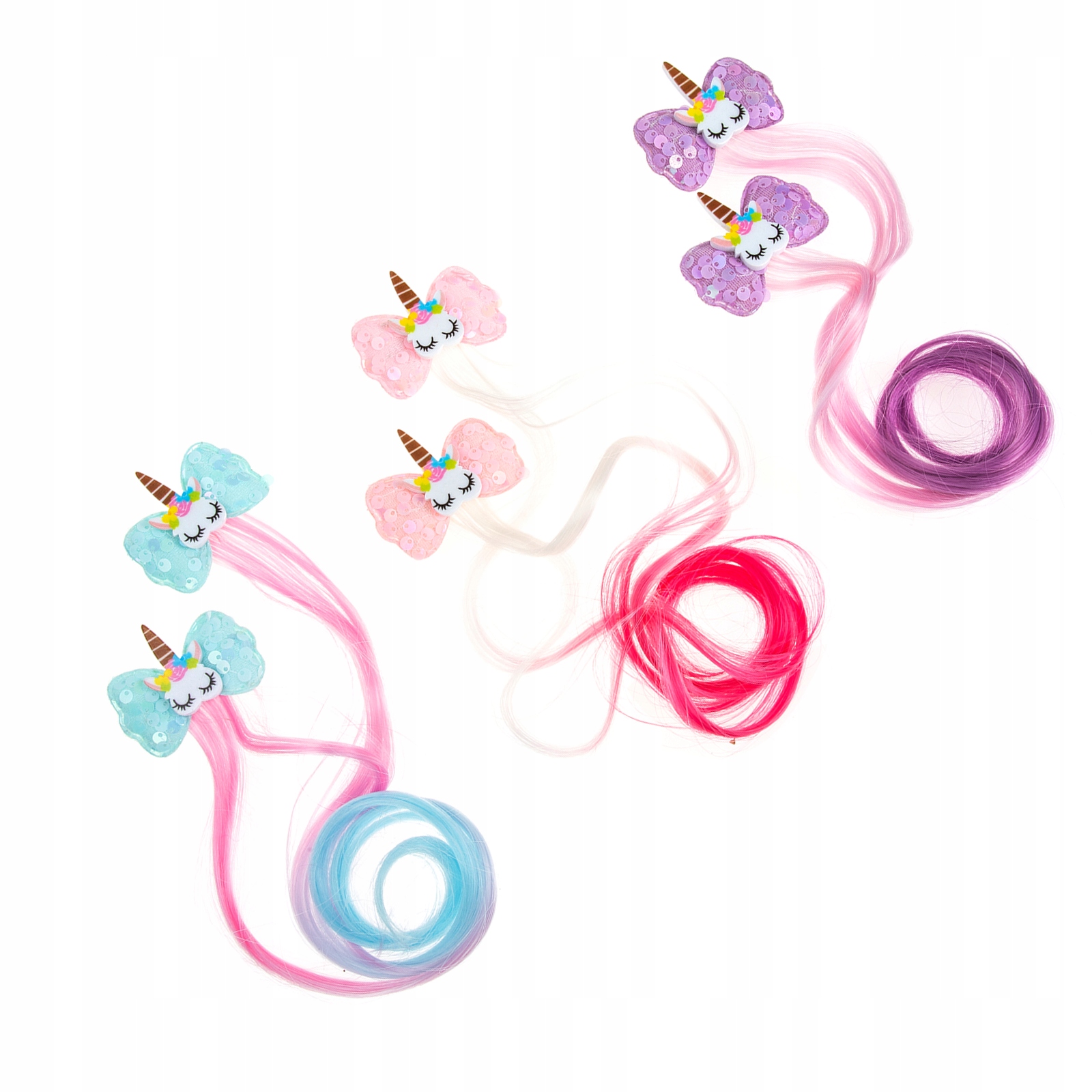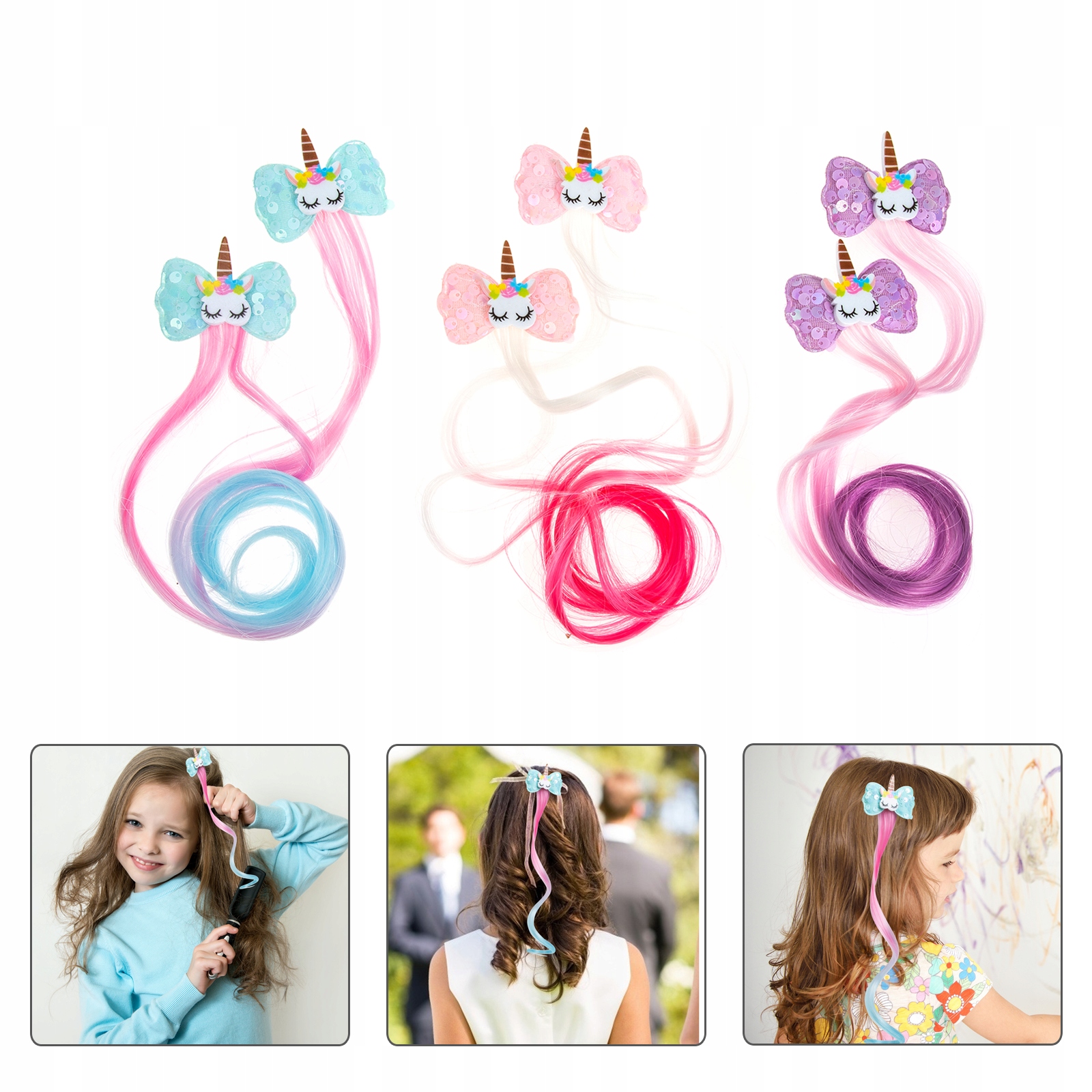 ✅ Кожен кліпса має бантик і прикрасу з єдинорога, колір якого збігається з кольором перуки.