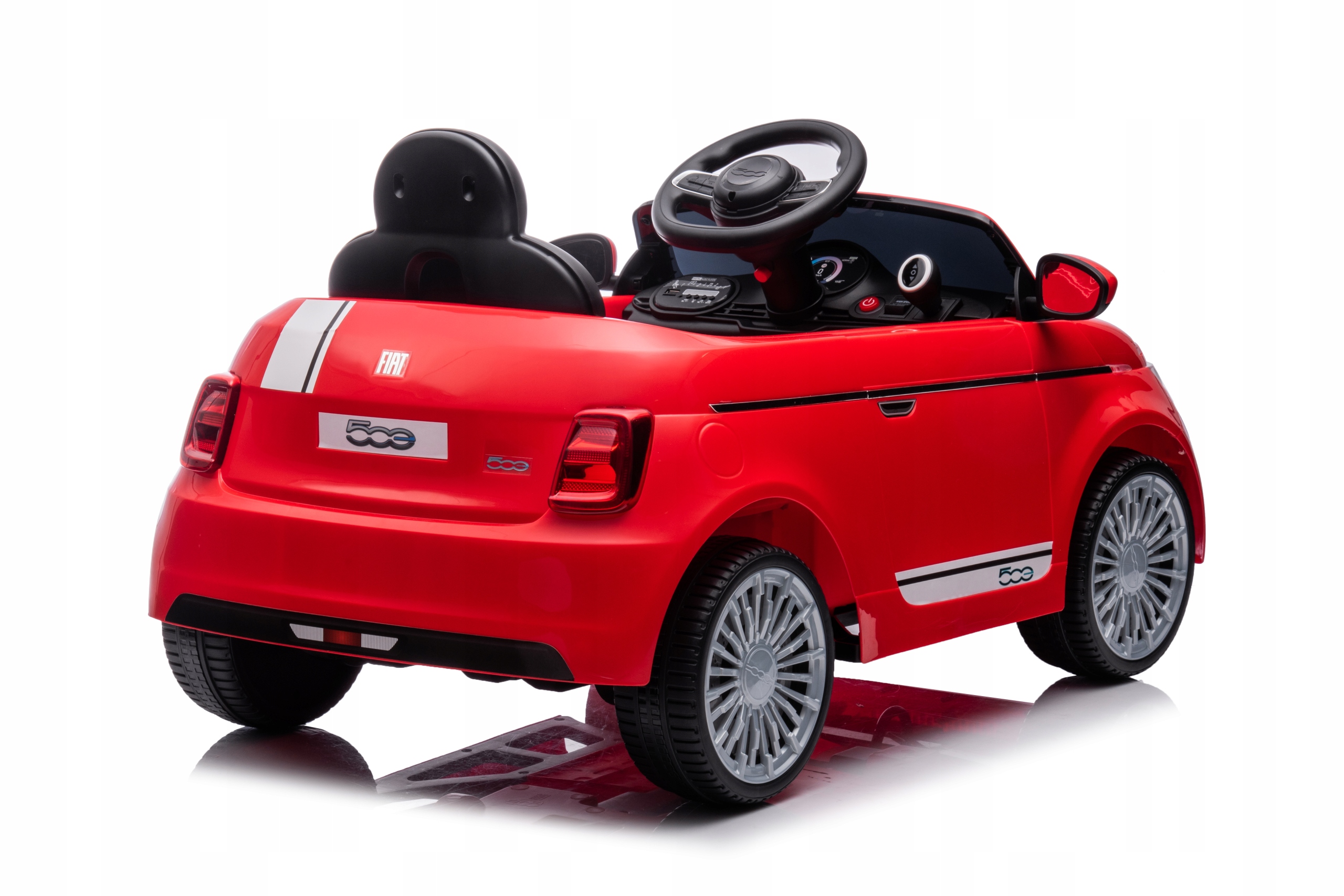 Автомобіль має кермо, низьке сидіння з ременем безпеки та ергономічну спинку, що полегшує посадку та висадку. Автомобіль розганяється повільно і плавно. Крім того, електромобіль Fiat 500 оснащений дисплеєм з музикою, що є ідеальним враженням. Він також має переднє та заднє освітлення.