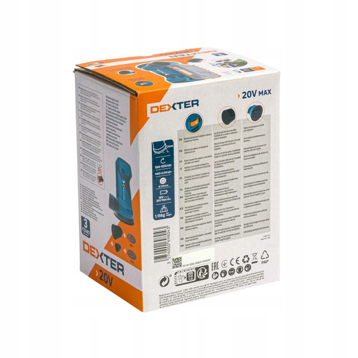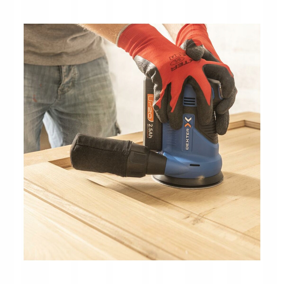 Акумуляторна орбітальна шліфувальна машина 125 мм 20 В DEXTER продається з мішком для пилу для збору бруду та адаптером для підключення до пилососа, який допомагає зменшити забруднення під час роботи в приміщенні. Ергономічна ручка пропонує два варіанти утримання: однією і двома руками. Протиковзке покриття пристрою забезпечує оптимальне захоплення; Продукт сумісний з літій-іонними акумуляторами серії UP20. Для оптимального використання рекомендується використовувати батарею 2,5 Ач (не входить в комплект). Акумуляторна орбітальна шліфувальна машина DEXTER на 20 В ідеально підходить для грубого та досить точного шліфування поверхні. Самоклеюча ніжка дозволяє легко і швидко прикріпити абразивні диски з різною зернистістю і діаметром 125 мм. У комплекті з пристроєм є 2 шліфувальні диски Р80 (для грубого шліфування) і Р120 (для тонкого шліфування). Перемикач швидкості (від 0 до макс. 6) розміщений для легкого доступу та дозволяє регулювати швидкість диска відповідно до застосування та матеріалів.