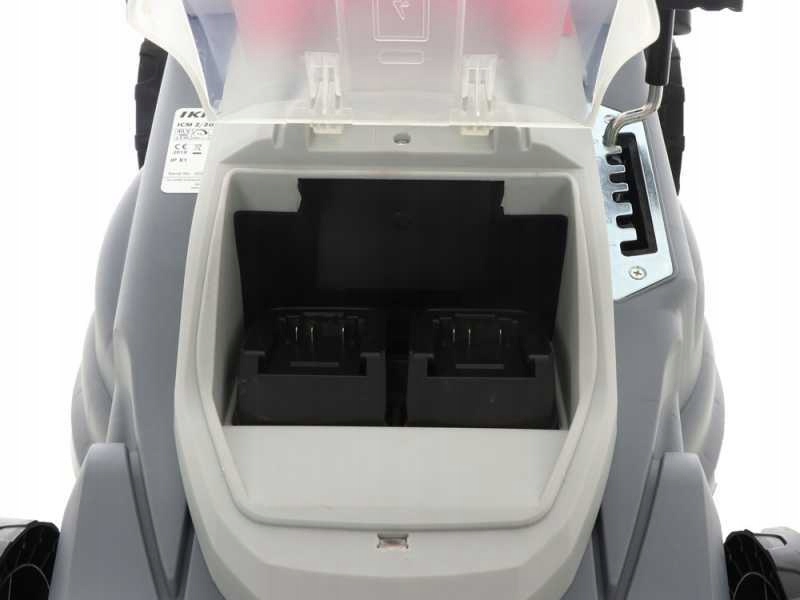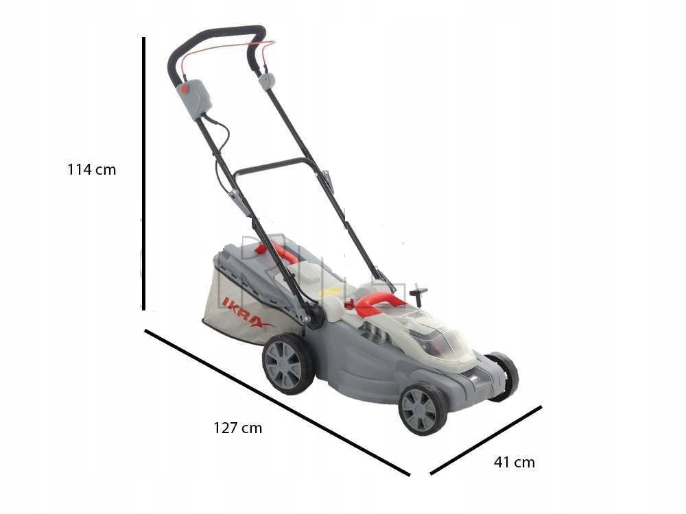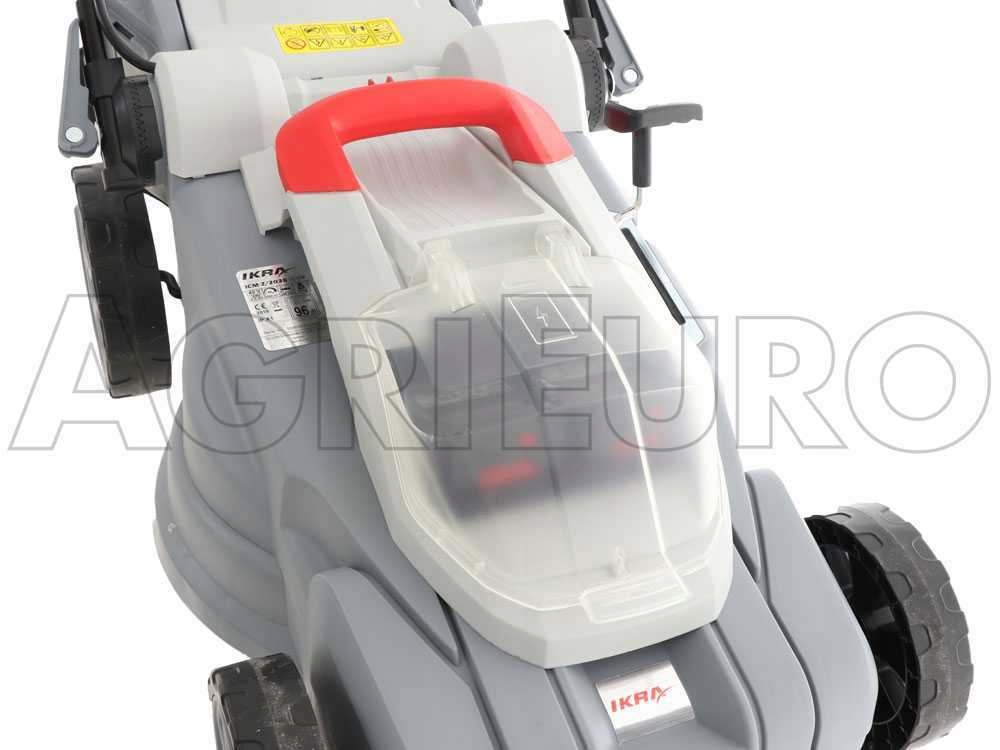 Косарка Ikra живиться від двох батарей 20 В, які з’єднані послідовно. . Ширина зрізу косарки 38 см. Травосбірник вміщує 40 літрів. Завдяки вазі 16 кг і практичній ручці машинку легко транспортувати..