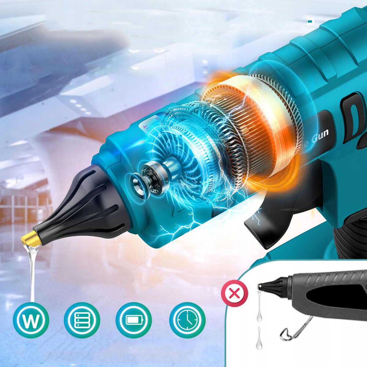Швидке нагрівання та висока ефективність: завдяки 100 Вт Нагрівач PTV, нагрівається до 150°C за 120 секунд. Порівняно з клейовим пістолетом потужністю 40 Вт час нагрівання на 50% коротший, а ефективність роботи краща. Покращує ефективність склеювання, оскільки це швидше, ніж швидкість плавлення. Готовність за 3-5 хвилин зі швидкістю клею 0,63 унції за хвилину - порівняно з моделями 0,07-0,2 унції.