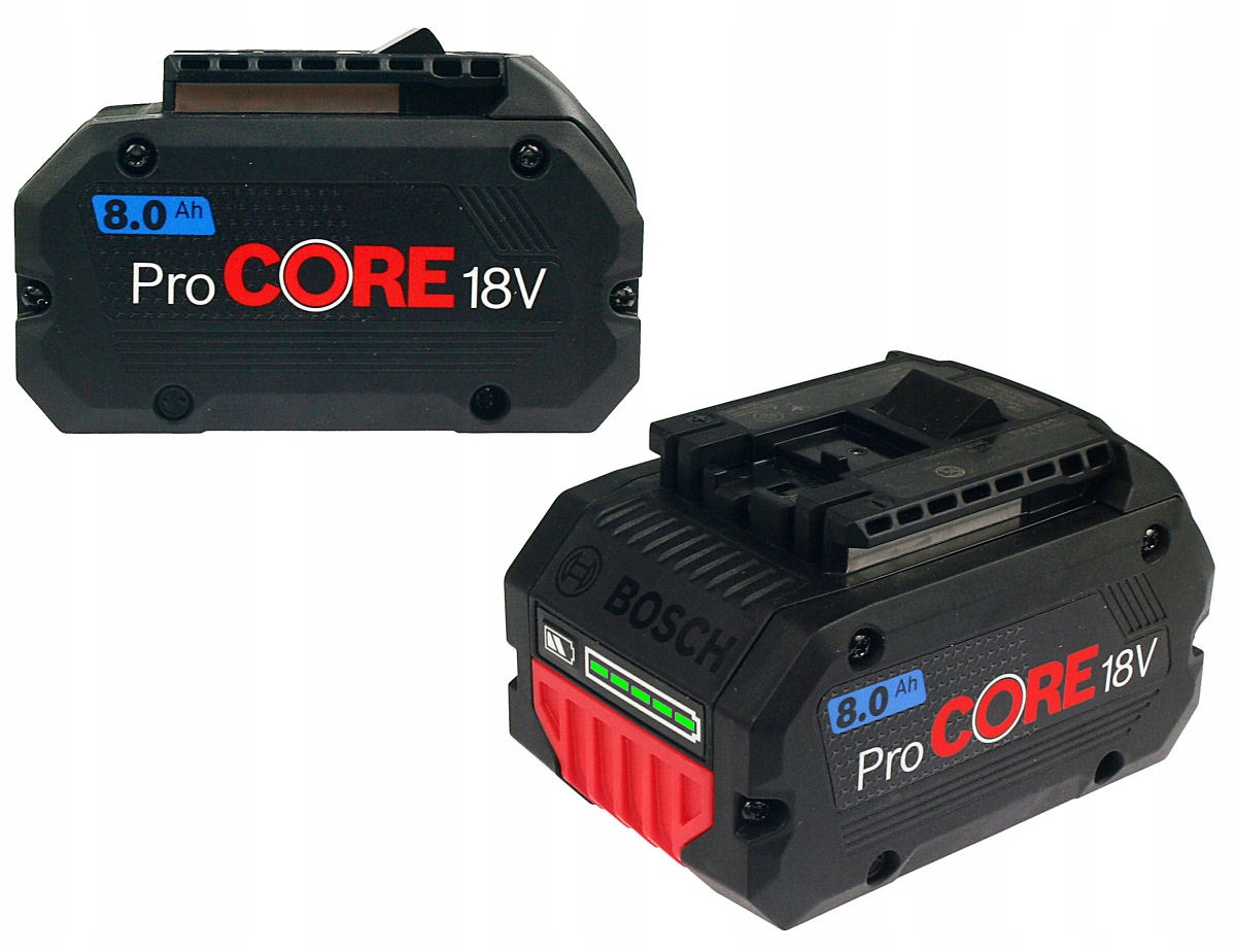 2 літій-іонні батареї 18 В типу ProCore PREMIUM ємністю 8,0 А·год із вбудованим індикатором стану заряду батареї, призначені для роботи під дуже великим навантаженням, перевірені за професійними критеріями з дуже низьким внутрішній опір, виділяються виключно тривалим терміном служби навіть при роботі при низьких температурах, і в той же час вони маленькі і легкі