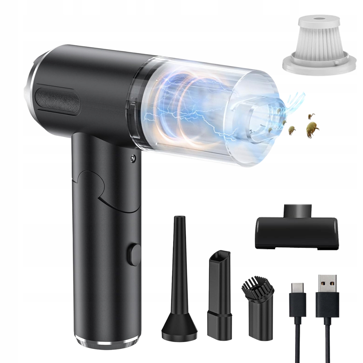 🍃Акумуляторний пилосос – це маленький і портативний пилосос: Маленький пилосос маленький і легкий, важить лише 400 г, простий у використанні, транспортуванні та зберіганні. Завдяки ергономічній ручці цей портативний пилосос зручно лежить у руці та не обтяжує зап'ястя. Бездротова конструкція та запуск однією кнопкою. Вбудований високоефективний двигун дозволяє легко швидко очистити тріщини у вашому домі/офісі/автомобілі, як-от розсувні двері, дивани, клавіатури, сидіння тощо.