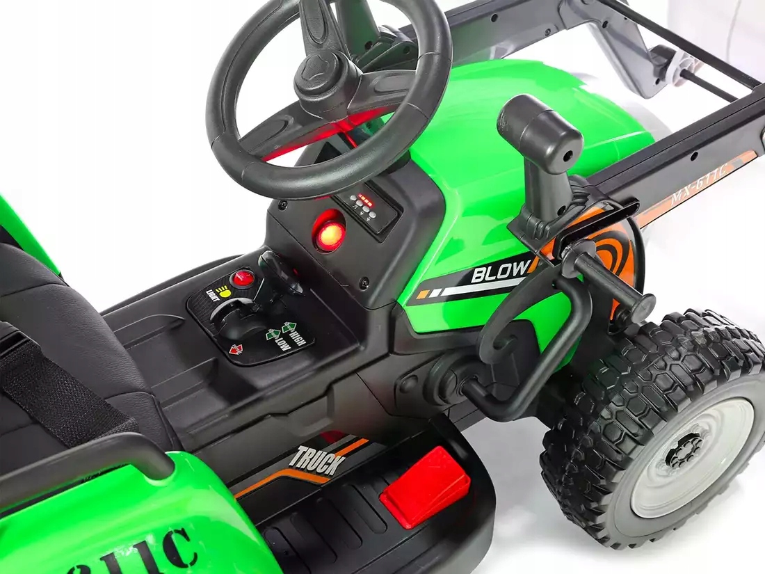 Він має знімний ковш навантажувача що дозволяє завантажувати сипучі матеріали або навіть доставляти пісок до пісочниці. Управління ковшем здійснюється вручну трактористом. Коли дитина грає з батьками або друзями, кермо з гудком дозволить попередити про наближення автомобіля. Завдяки вбудованим динамікам музика зробить поїздку кожної дитини ще приємнішою. Вбудований роз'єм USB дозволить вам слухати улюблену пісню вашої дитини.