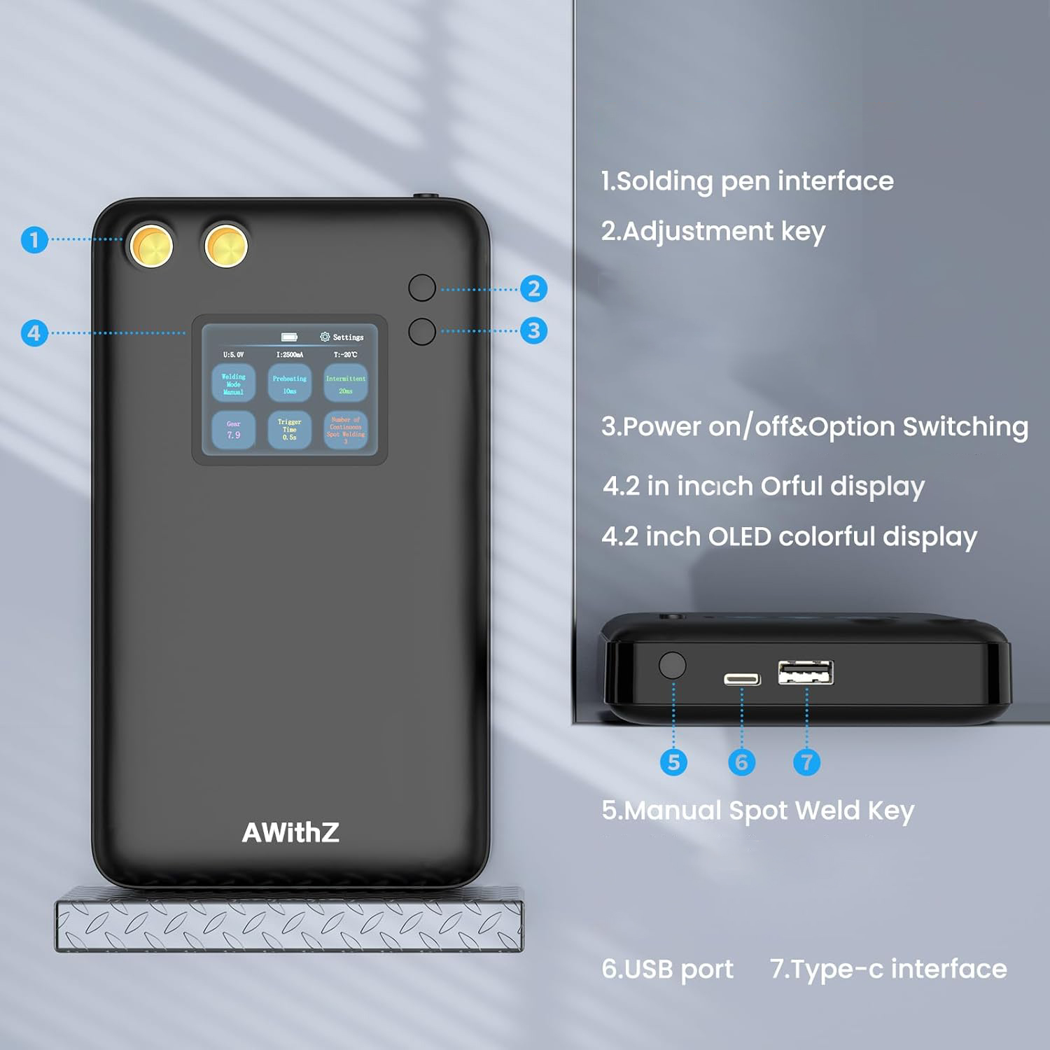 - Наш мініатюрний зварювальник виготовлений з полімеру високої потужності 5000 мАг з можливістю зарядки літієвого акумулятора із зарядкою Тип кабелю C