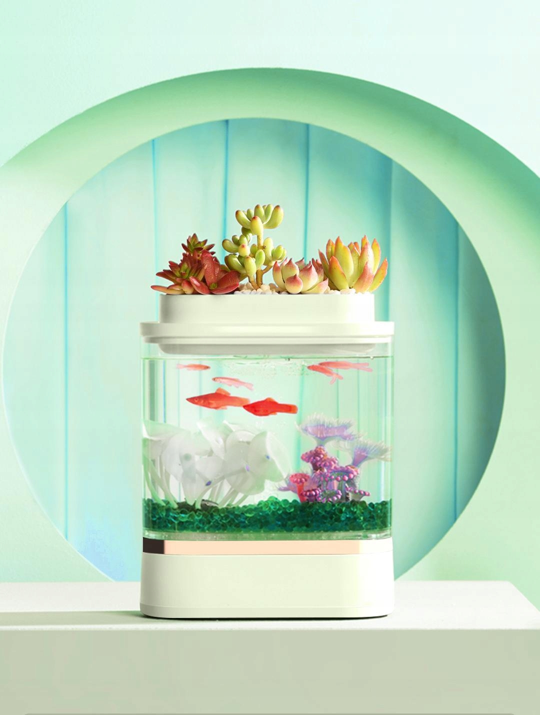 Рослини ростуть на верхньому рівні, а на нижньому рівні є риба, що з'єднує рух та статику, яка жива і декоративніше!