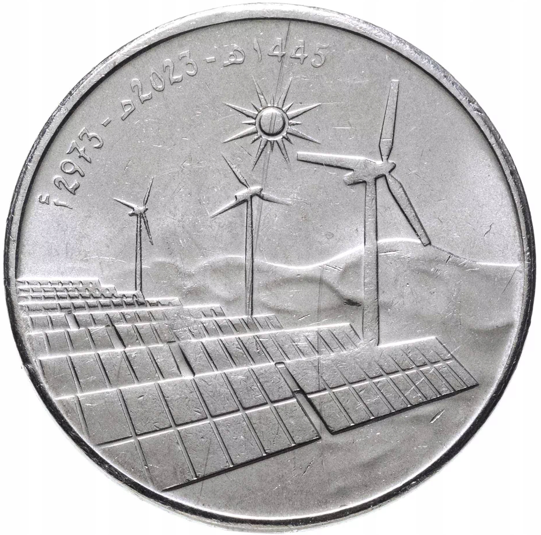 Аверс: композиція із зображенням відновлюваних джерел енергії, що символізує енергію майбутнього – Сонця, вітряних турбін і фотоелектричних панелей, на задньому плані дюни. Угорі по краю дата за берберським, григоріанським і мусульманським календарем: أ 2973 – م 2023 – ه 1445