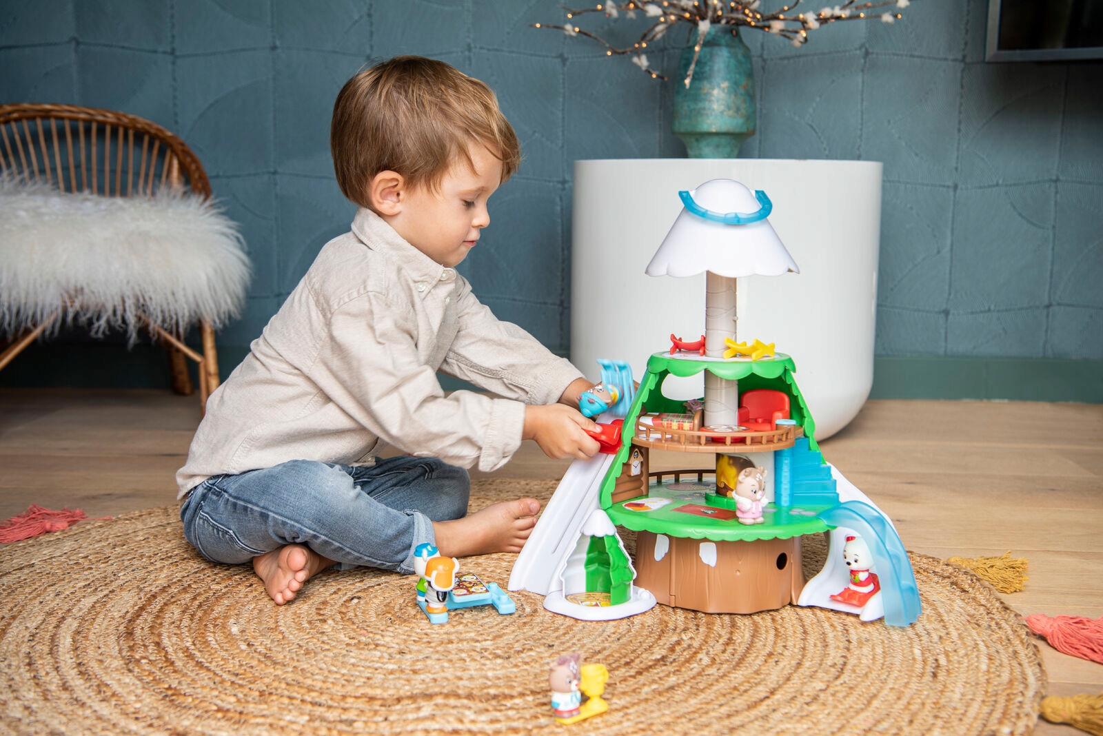 Дуже великий альпійський будиночок у формі засніженої ялинки містить: одного плюшевого ведмедика Скотта та 9 аксесуарів - столик для пікніка, 2 шезлонги, крісло, столик, чашку, пару лиж, сноуборд і санки. Складання іграшки вимагає дорослий. Іграшка для дітей від 18 міс. Радимо протерти поверхню іграшки мильною водою та вологою тканиною.
