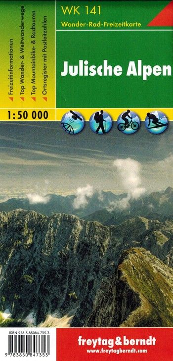 Складна двостороння туристична карта Юлійських Альп у масштабі 1:50 000. Легенда: англійською, німецькою, італійською та словенською мовами.