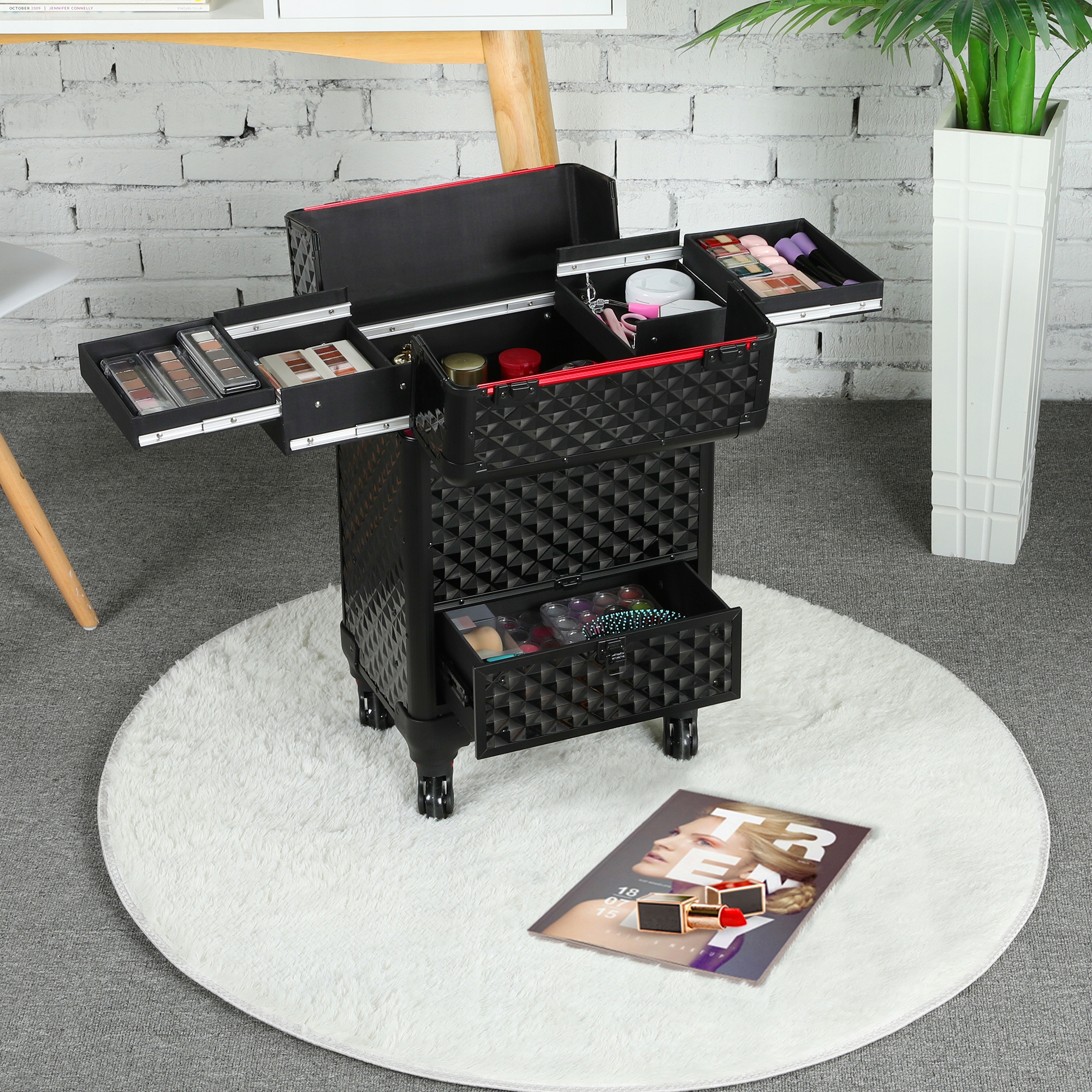 🍹 Ця багатоквальня косметична валіза була розроблена для підтримки порядок та легкого доступу до косметики та інструментів макіяжу. має 4 висувні бічні полиці, оснащені стійкими до іржі , і в той же час постійні алюмінієві путівники , забезпечуючи надзвичайно плавну роботу - ідеально підходить для зберігання дрібних предметів. Верхня, простора камера може вмістити обладнання для укладання волосся, наприклад, сушарки, випрямлячі/бігуді, піддони та інша більша косметика. Нижній ящик підходить для зберігання пензлів для волосся та низьких пляшок. Знімні, кола, що обертаються в кожному напрямку , роблять цей косметичний багажник на колесах зручними для транспортування. мінімалістична конструкція та стильний зовнішній вигляд відрізняються від інших косметичних валіз, доступних на ринку.