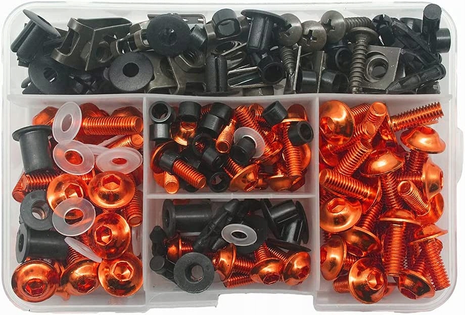Набір алюмінієвих гвинтів з нейлоновими прокладками та гумовими втулками. Втулки мають металевий сердечник. Гвинти використовуються для кріплення обтічників і вікон мотоциклів, вони також підходять для квадроциклів, скутерів і мопедів.