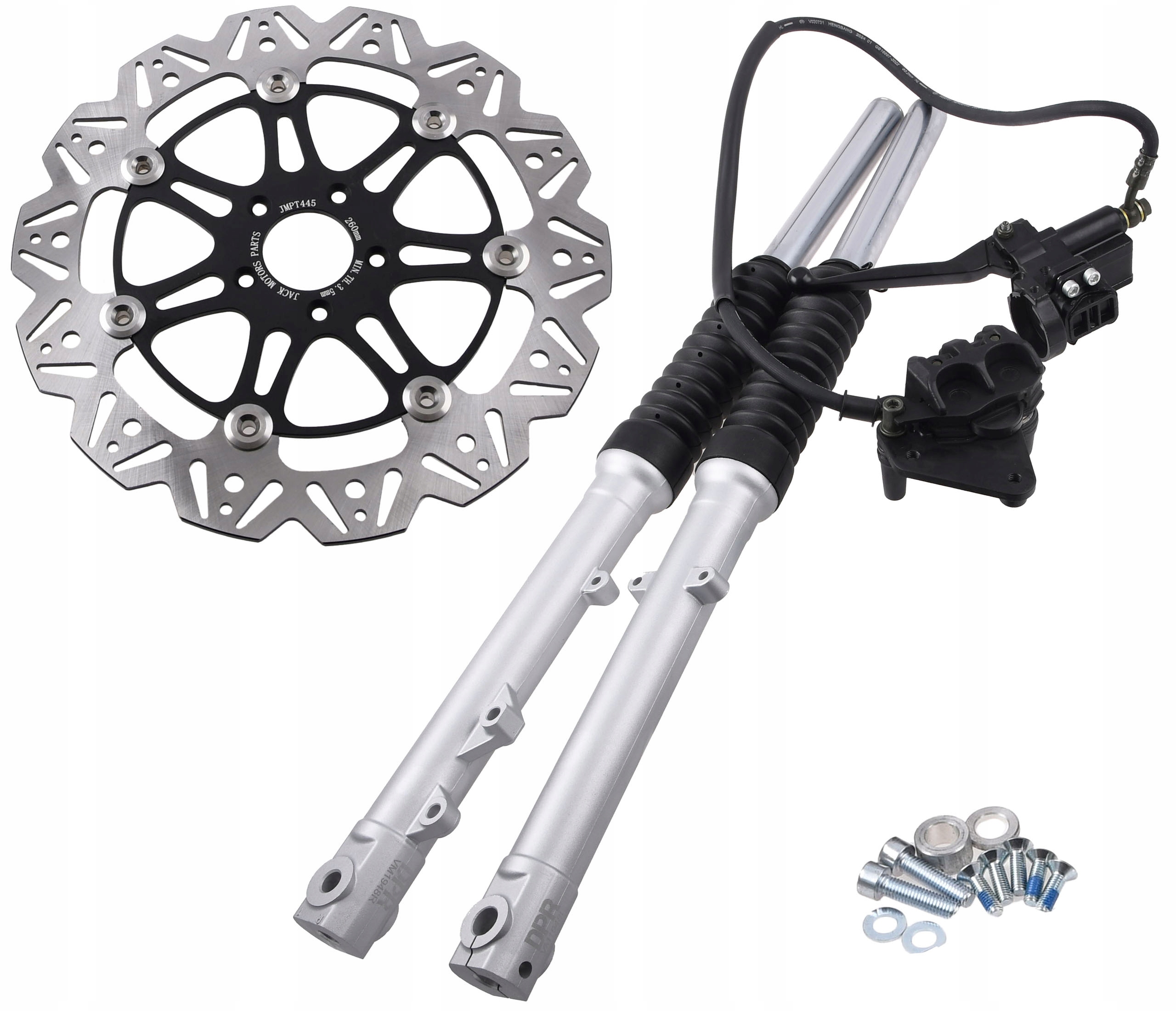ОПИС: ТЕЛЕСКОПИ, АМОРТИЗАТОРИ, ПЕРЕДНЯ КОРОТКА ВЕРСІЯ 71см + ПЛАВАЮЧИЙ ГАЛЬМІВНИЙ ДИСК EVO 260мм + СПЕЦІАЛЬНИЙ ГАЛЬМІВНИЙ НАСОС + 2-ПОРШНЕВИЙ ГАЛЬМІВНИЙ СУППОРТ + ГАЛЬМІВНИЙ ШЛАНГ. КОМПЛЕКТ ПІДХОДИТЬ БЕЗ БУДЬ-ЯКИХ МОДИФІКАЦІЙ (ПОТРІБНА ТІЛЬКИ ПЕРЕДНЯ МАТОЧИНА ВІД S53) ДУЖЕ ВИСОКА ЯКІСТЬ ПРОДУКЦІЇ ДЛЯ НІМЕЦЬКОГО РИНКУ БРЕНДУ DPR.