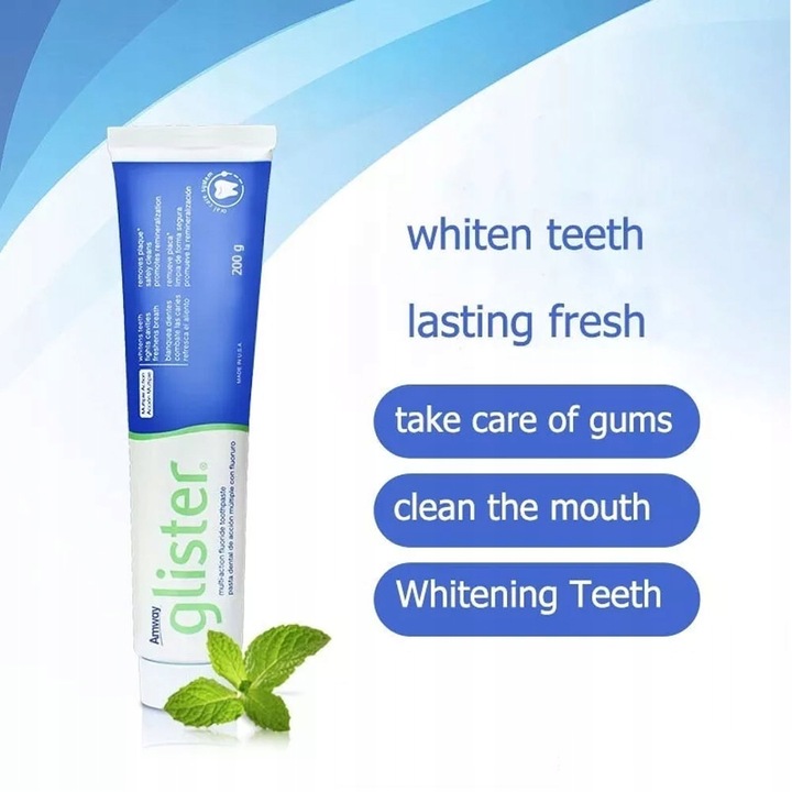 Зубна паста Glister — це продукт, який полюбляють клієнти з усього світу за чудовий смак і приємні відчуття під час чищення. Залишає відчуття чистих і гладких зубів. Що ще важливіше, він підтримує здоровий баланс унікального мікробіому порожнини рота і, якщо його регулярно використовувати, допомагає видалити зубний наліт, який є однією з причин карієсу. Формула містить перевірену силу фтору та вибрані улюблені природні інгредієнти, включаючи кремнеземний поліруючий агент і сертифіковану Nutrilite перцеву м’яту в нашій ексклюзивній смаковій композиції.
