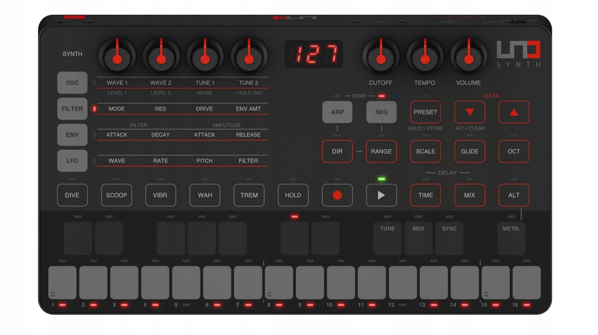 Вбудований ефект затримки, синхронізований з UNO Налаштування темпу синтезатора ще більше розширює звукову палітру та тип звуків, які він може генерувати, додаючи глибини повторюваним патернам арпеджіо або послідовностям, оскільки параметри фільтра та осцилятора модулюються та регулюються на льоту.