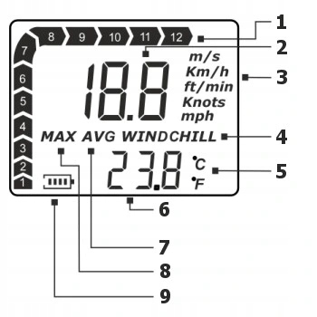 - По-перше, користувач має можливість вибір одиниці швидкості повітря. Залежно від характеру вимірювання, ви можете встановити: кілометри на годину, милі на годину, фути на хвилину, метри на секунду або вузли, що робить прилад універсальним і адаптується до різних потреб .< /li>