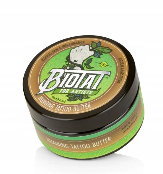 Масло для татуювань Biotat, що знеболює, не містить барвників або штучних ароматизаторів. Евгенол, що міститься в гвоздиковій олії, алое та лаванди, зменшує біль і знеболює місце татуювання. Завдяки антибактеріальним властивостям масло зменшує почервоніння та запалення.