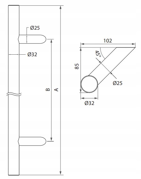 Поручня двостороння, кругла 45°, 32х1200 мм (AISI 304, універсальна, сатин)