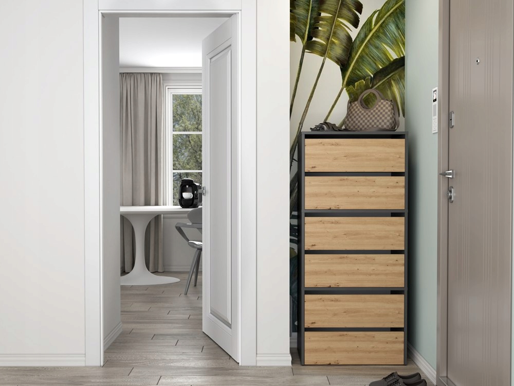 шафа взуття Modo є модульним - ви можете вільно розширити та створити практичний набір, приєднавшись до іншої з будь -якої сторінки. Ламінована товщиною 16 мм.