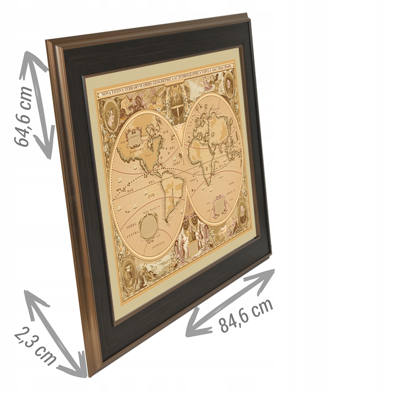 Карта світу в незвичайному стародавньому світінні. Сучасна векторна структура дизайну, створена за зразком відомої карти ґравера Генріка Гондіуса II (1630 р.). Розмір друку 50 x 70 см у рамах Donum Artis.