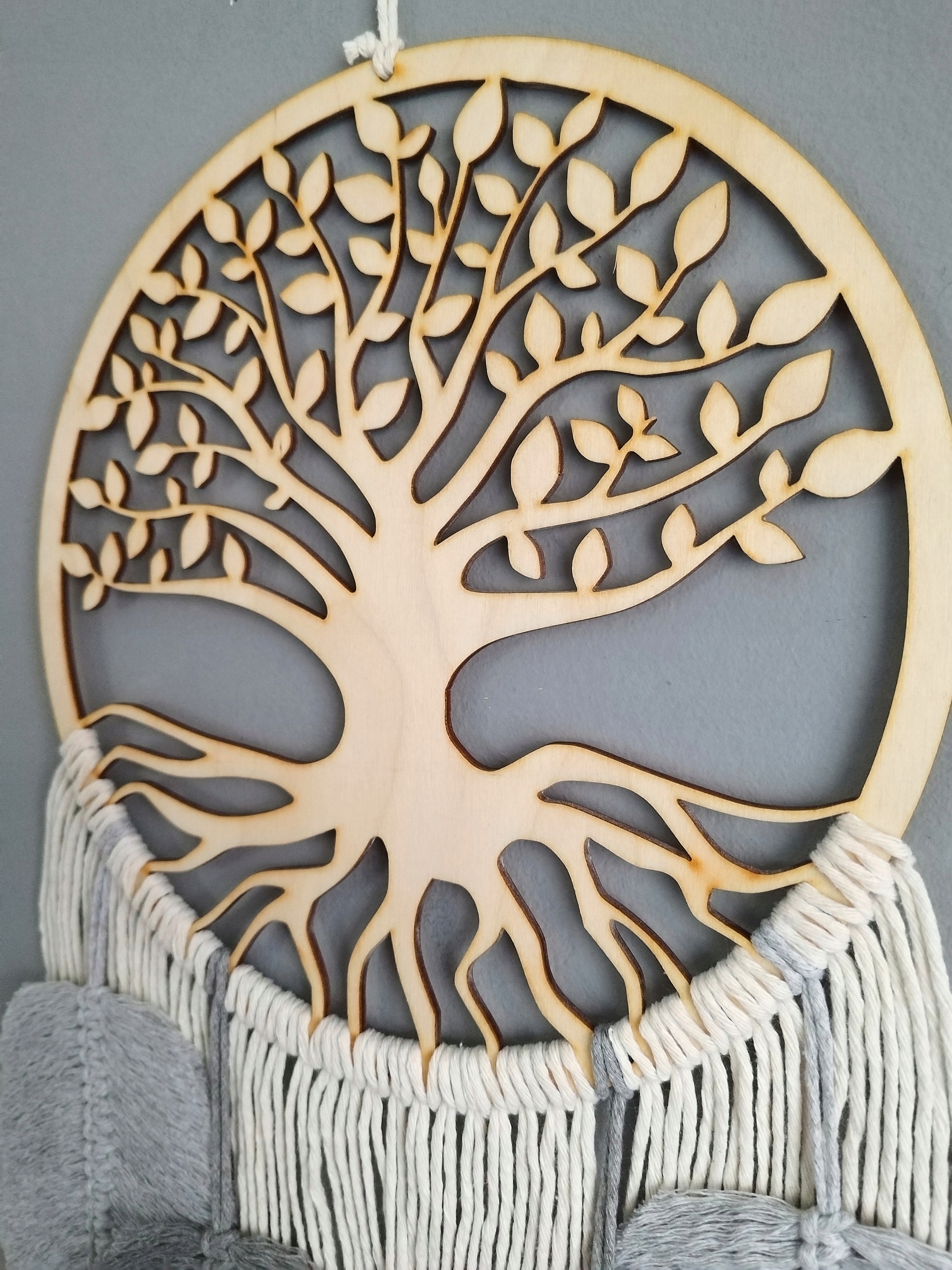 Łapacz snów drzewo życia szary Makrama listki Boho