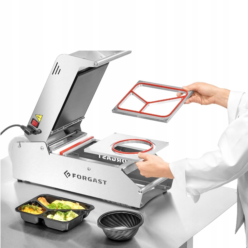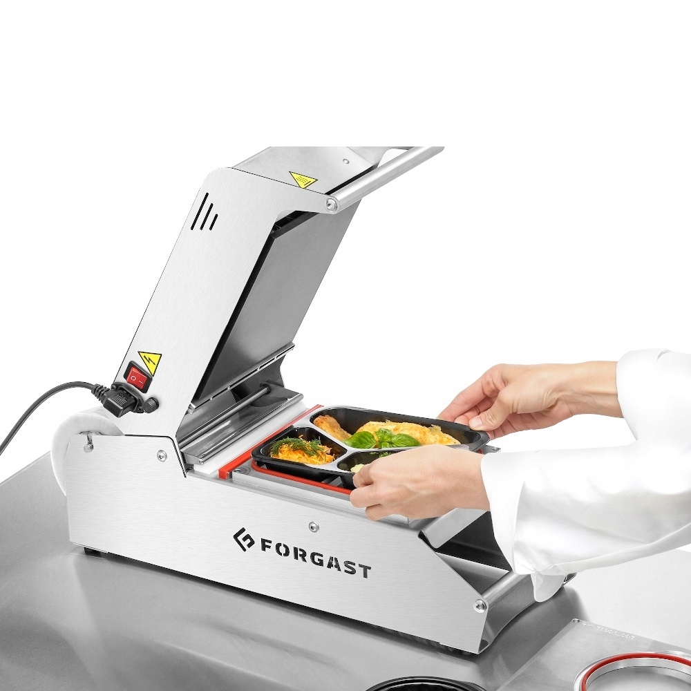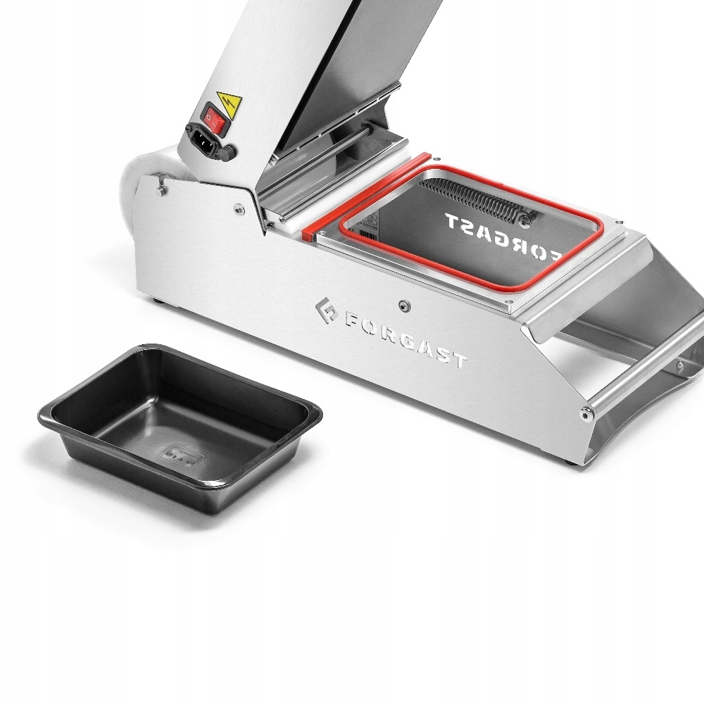 Ручний запаювач лотків із матрицею від Forgast. Корпус з нержавіючої сталі. Ущільнювальна поверхня покрита антипригарним покриттям. Запаювач дозволяє фасувати обідні страви в лотки найбільш універсальних розмірів - 22,7х17,8 см.