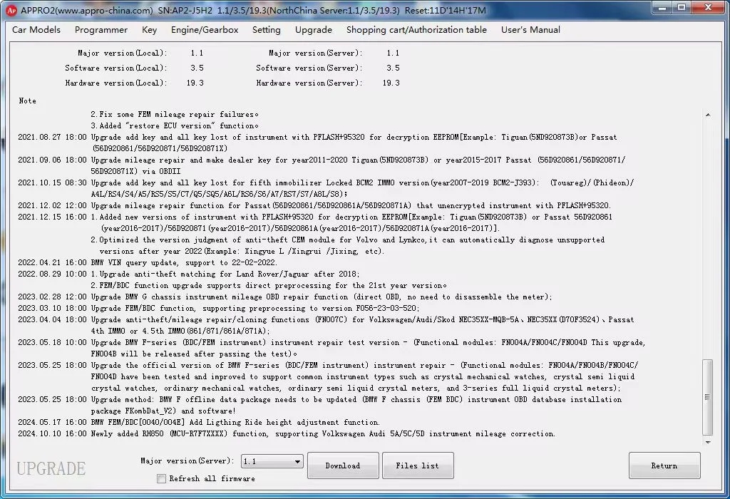 Підтримує програмування ключів BMW EWS, CAS1, CAS2, CAS3, CAS4, FEM, BDC, BDC2, повторне калібрування кластера CAS3/CAS4/FEM/BDC через OBD, програмування та повторне калібрування ключів BDC серії F калібрування кластера через OBD (включно з версією 085), додавання для BMW BDC2 на стенді.