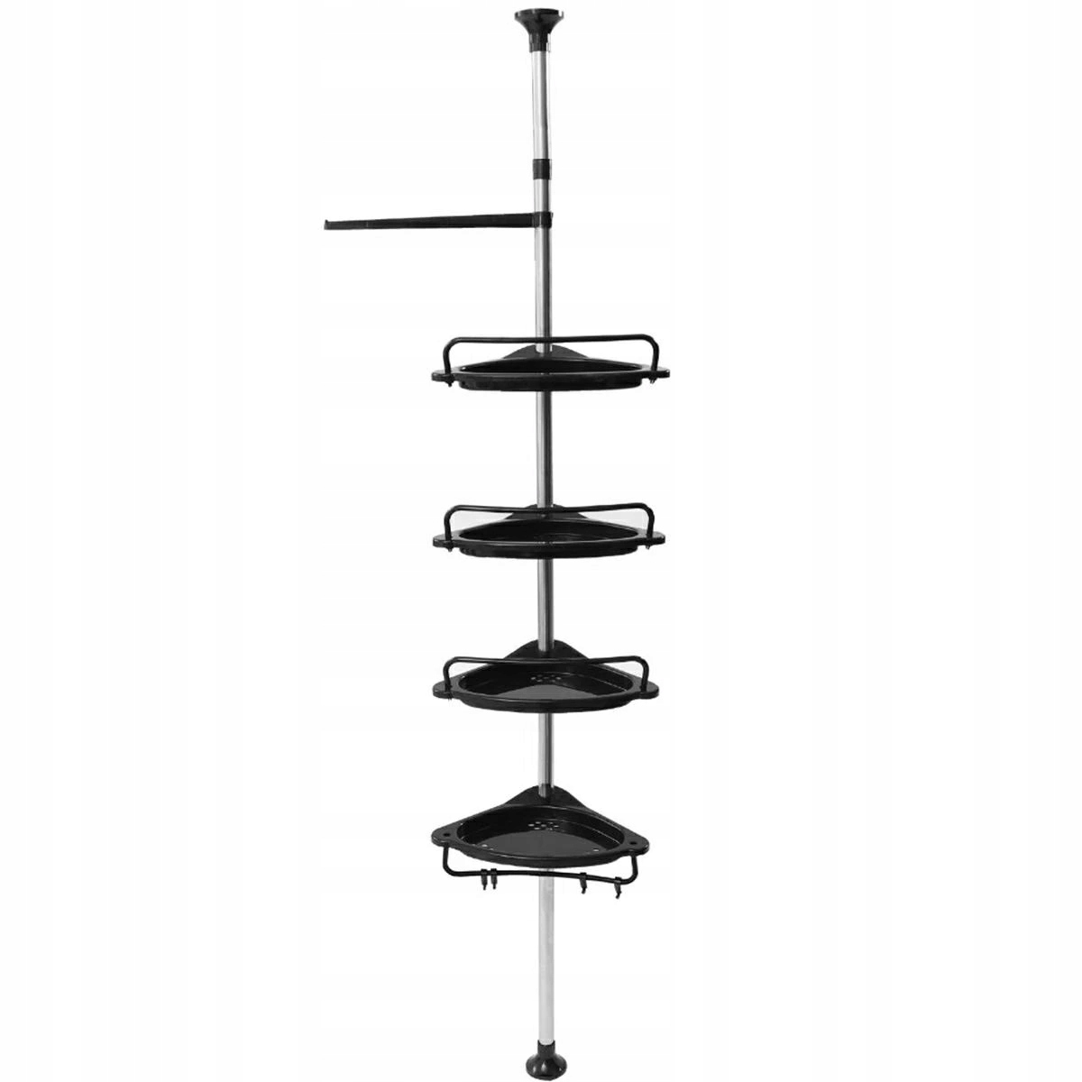 Зручна телескопічна полиця для ванної з регульованою висотою. Оснащений 4 трикутними поличками та рушником з регулюванням положення. Додаткові, знімні рушники. Полиця - це розумний спосіб заощадити місце у ванній. Розумна конструкція запобігає накопиченню води. Обкладинка в передній частині кожної полиці запобігає випадковому колапсу косметики. Постійна та неінвазивна установка з телескопічним кріпленням регульованої довжини. Він ідеально підходить для зручного зберігання косметики та аксесуарів для ванної кімнати.