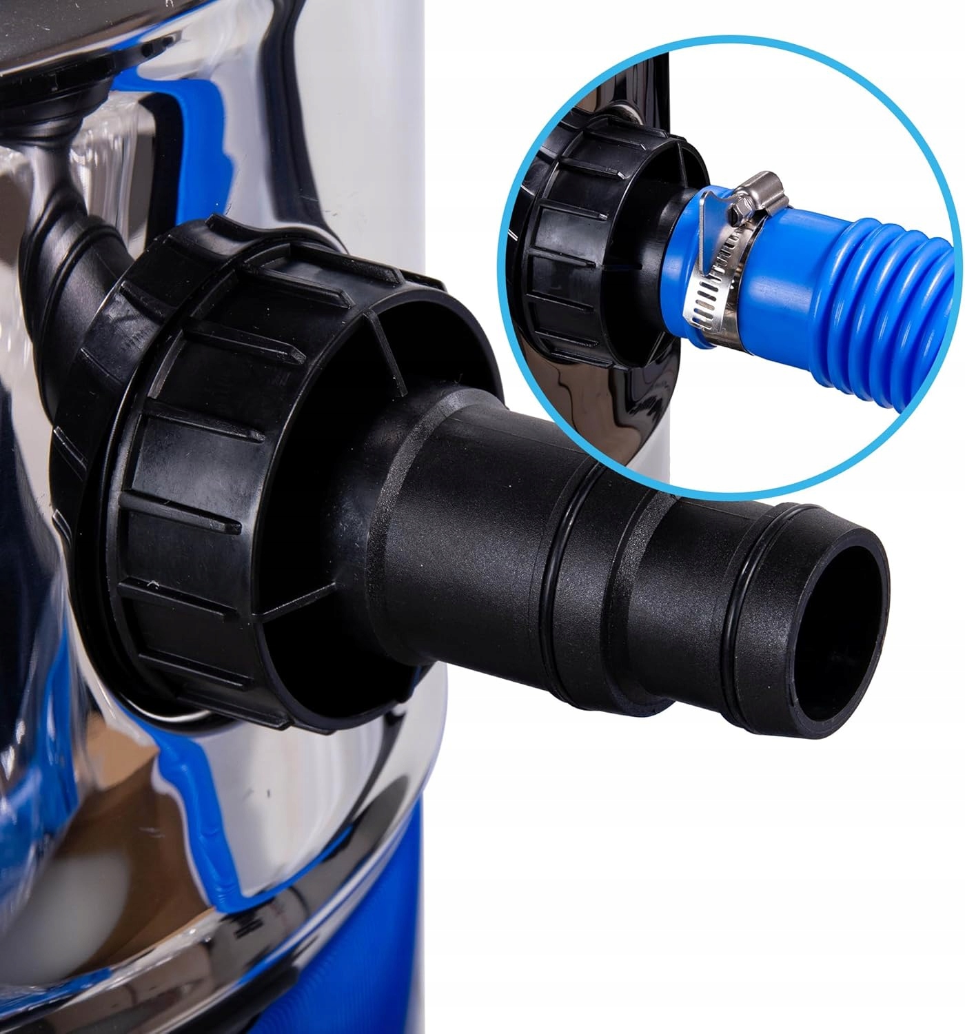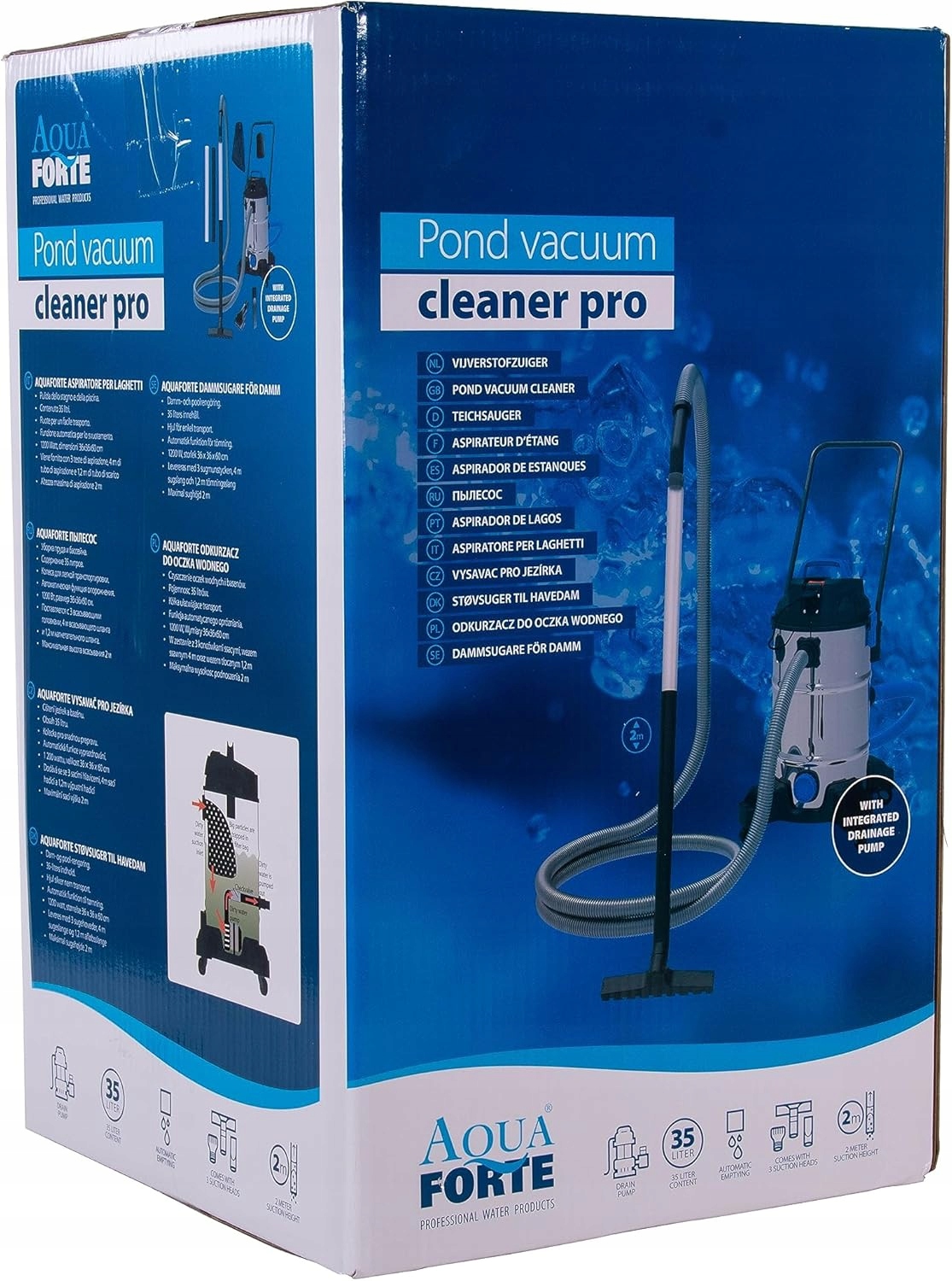 Новий пилосос водного ставу, що дозволяє забезпечити технічне обслуговування суглобів. Оснащений внутрішнім зануреним насосом для брудної води, яка постійно стікає смоктану воду. Завдяки горизонтальному розміщенню зануреного насоса внизу резервуару він не може працювати сухим. Суперзвана вода вперше пропускається через закритий пакет попереднього фільтра, завдяки якому захоплюються листя, водорості, гілки, каміння, земля тощо. Сумку фільтру можна легко зняти і відкрити для очищення великими гвоздиками блискавки. Вода, що протікає через фільтр -мішок, викидається до стічної води через внутрішній підводний насос. Коли втрата води не бажана, її можна перекачувати в менший фільтр (наприклад, сито фільтр, барабанний фільтр або невенний фільтр). Як зливний шланг, ви можете використовувати стандартний шланг Poofllex 32 або 38 мм. Це полегшує роботу з різною довжиною тригерних шлангів. Завдяки ефективній всмоктувальній турбіні з 1200 Вт, всмоктування може використовуватися на глибині до 2,5 метрів. Насос для занурення має окрему вилку, завдяки якому всмоктувальник також може бути лише для сухого пилососа без стікання води. У великому резервуарі ви можете зберігати до 35 літрів води.