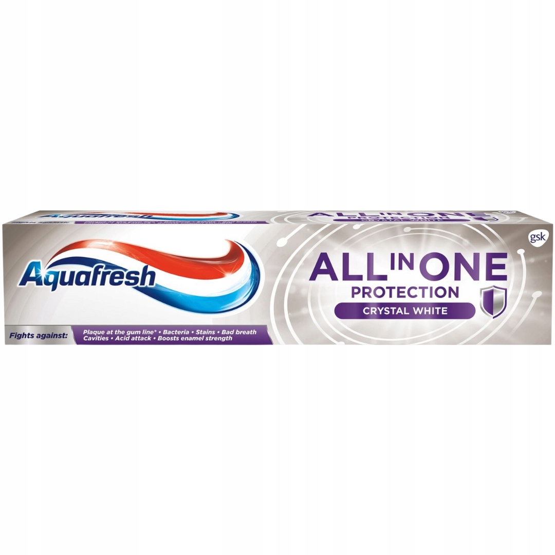 Aquafresh все в одному кристалічному білому - це відбілююча зубна паста, яка була створена з метою забезпечення комплексного захисту ротової порожнини та відбілювання зубів . Продукт характеризується формулою, яка забезпечує чотиривимірний захист: проти карієсу, бактеріальної пластини, відкладень та плям на зубах . видаляє неприємний запах у 80% відразу після того, як чистити зуби . Крім того, спеціально відібрана формула видаляє нальоту та відкладення, запобігає утворенню нових, що впливає на підтримку гігієни ротової порожнини.
