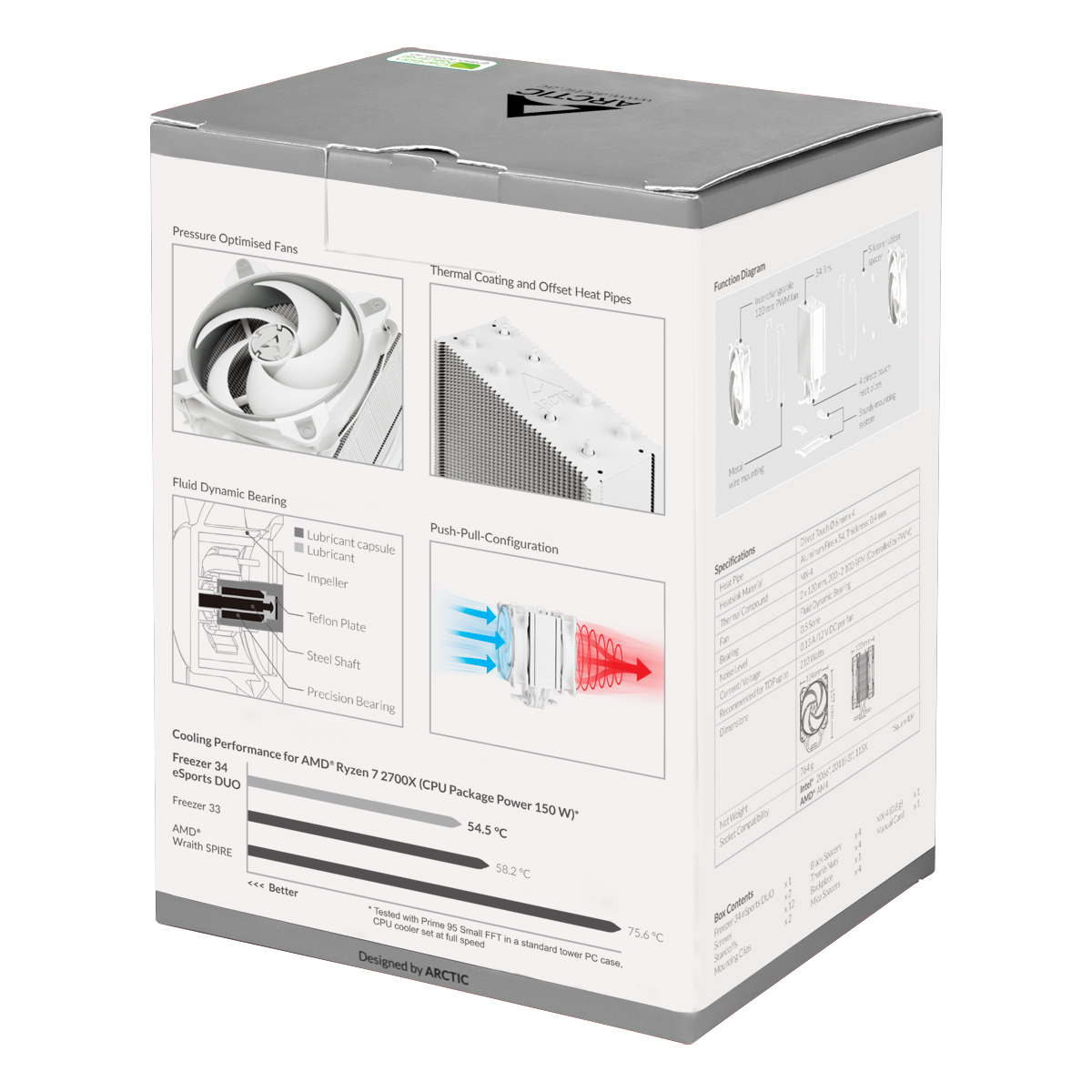 Підтримуючи належну температуру компонентів, ваш комп’ютер продовжує працювати. Процесор є одним з найбільш навантажених елементів у всьому комплекті, тому варто подбати про його охолодження. Arctic Freezer 34 eSports Duo — це рішення для охолодження, яке гарантує ідеальну температуру навіть під час важкої роботи системи.