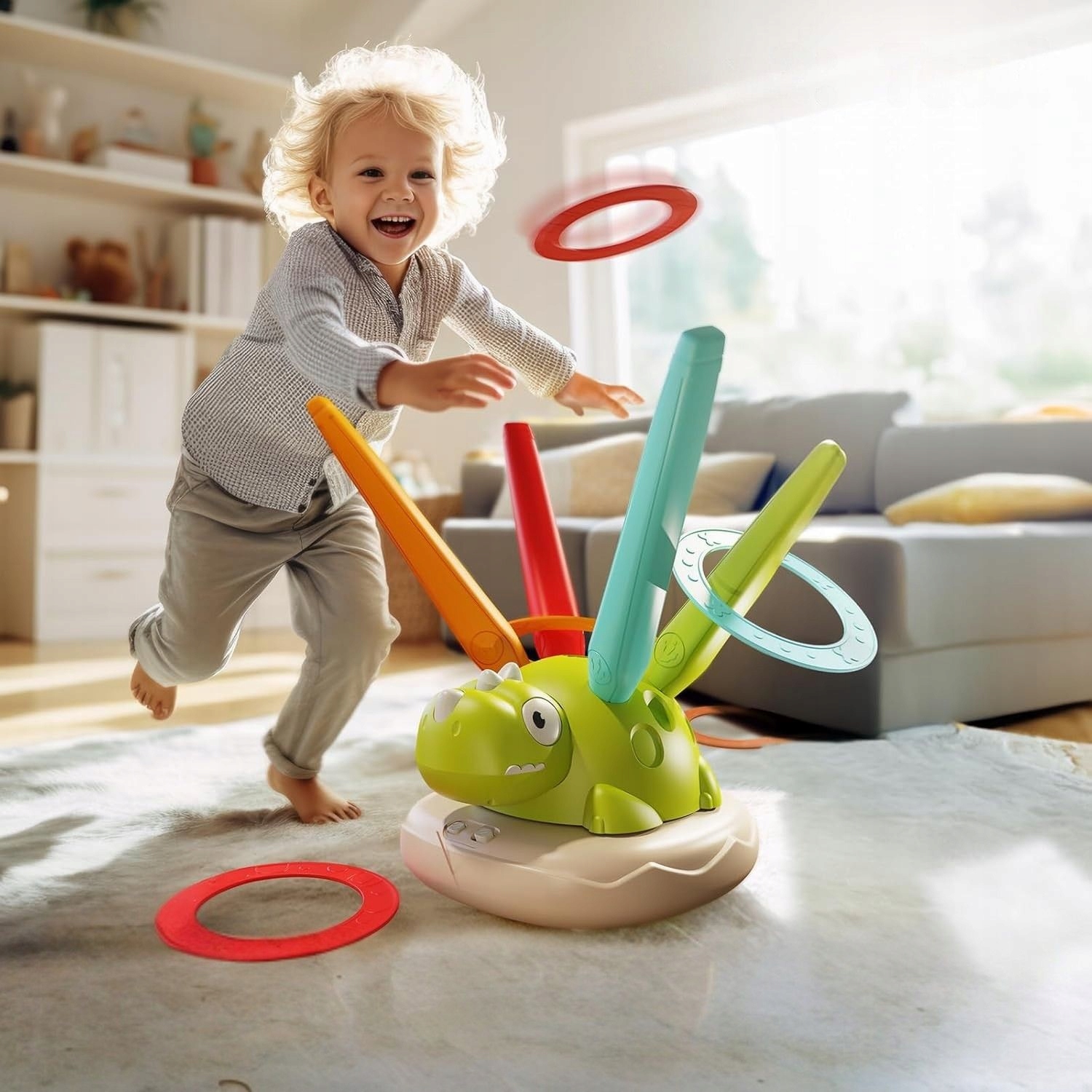 - ✅ Набір включає 12 кольорових ободів , які діти кидають на вертикальні пости. Рефлекс .