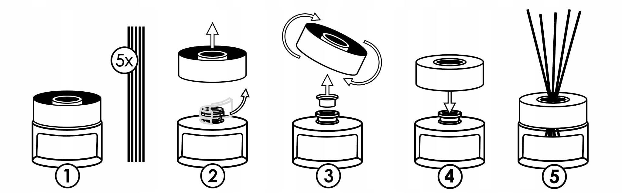 ✅ Дифузор оснащений п'ятьма ротанговими паличками, які забезпечують рівномірне та тривале виділення аромату. Ви можете регулювати його інтенсивність - просто використовуйте більше або менше паличок, відповідно до ваших уподобань.