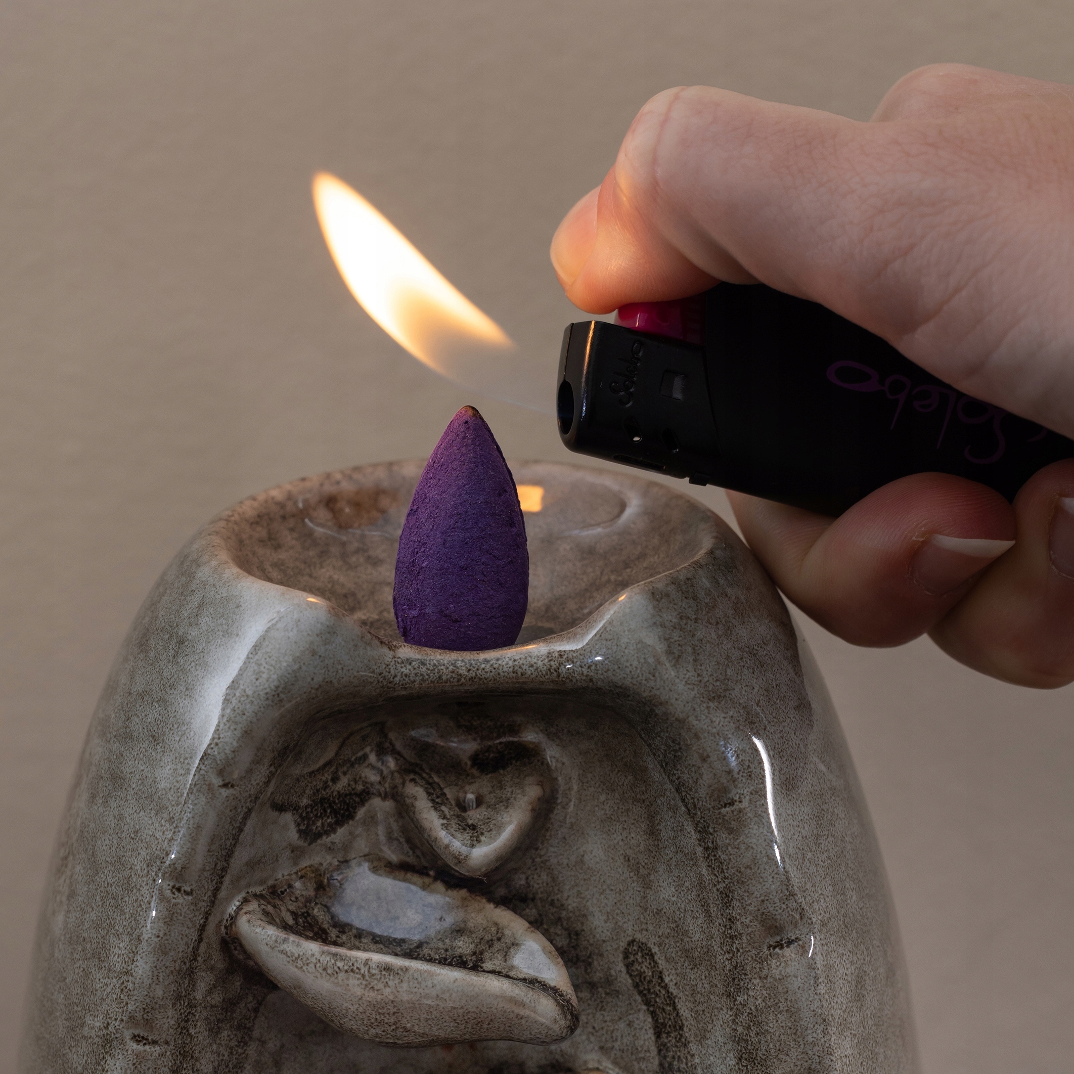 Піднесіть полум’я близько до ароматичної палички та не гасіть його відразу, так як ароматична паличка повинна добре світитися. Зачекайте трохи, поки вогонь не займе приблизно 1/3 всієї конічної ароматичної палички, потім загасіть вогонь, щоб негайно отримати ефект падаючого диму. Готовий! Тепер ви можете насолоджуватися приємним ароматом!
