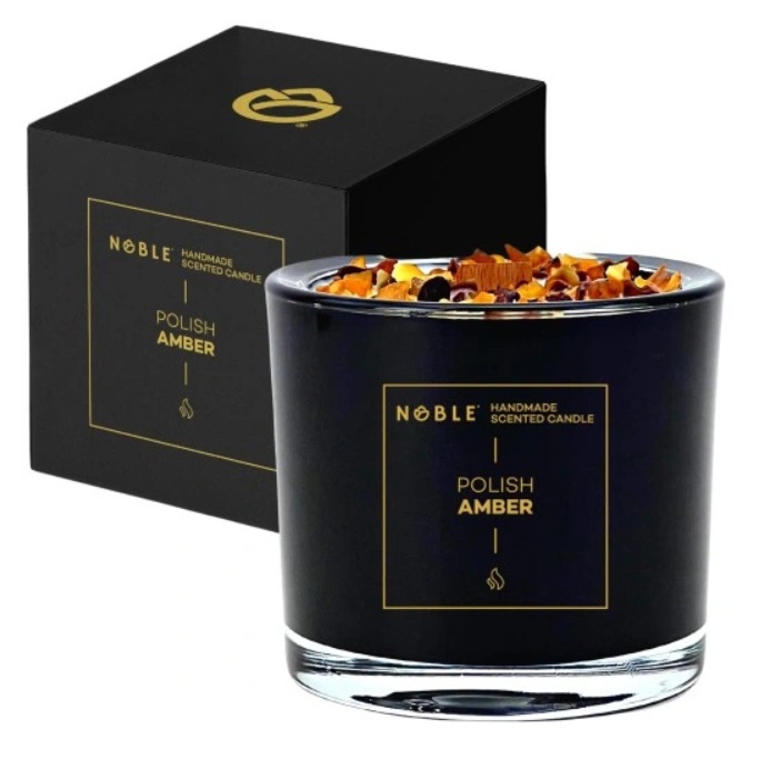 Віск із запахом сої містить частинки справжнього бурштину з Гданської затоки. Композиція натуральних ефірних масел з ароматом бурштину. Теплий, східний і чуттєвий аромат з нотами бергамоту та апельсина. Композиція аромату має східний відтінок на основі сандалового дерева. Основний і сильний аромат, як завжди, з максимальною інтенсивністю від NOBLE.