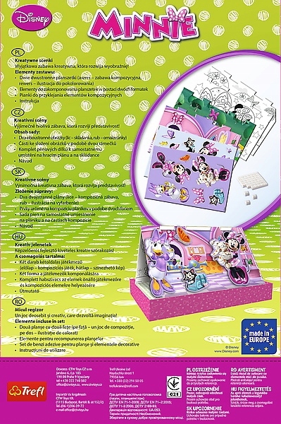 Креативні сцени Мінні. Унікальна творча гра, яка розвиває вашу уяву! Створюйте унікальні сцени, які ви можете складати відповідно до власних ідей. Розкажіть на їх основі історію. Ти любиш розмальовки? На зворотному боці дощок є дві ілюстрації, які ви можете самостійно розфарбувати. Щоб виставити свою роботу, ви можете розташувати її на основі коробки та прикрасити власну кімнату