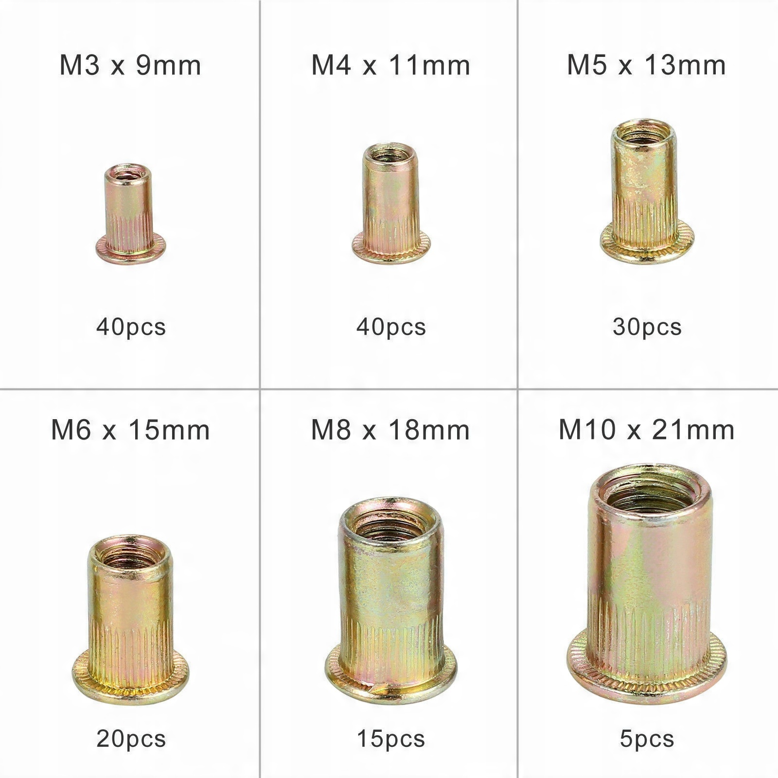 120 штук Упаковка: 50 x M4 заклепок, 35 x M5, 15 x M6, 10 x M8, 10 x Заклепкові гайки М10.