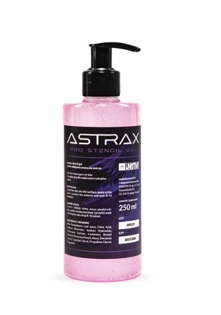 Unistar Astrax створений для професійних художників татуювань, які шукають продукти найвищої якості. Тому, крім своїх унікальних властивостей, цей гель містить алое віру, яка має заспокійливий і регенеруючий вплив на шкіру.