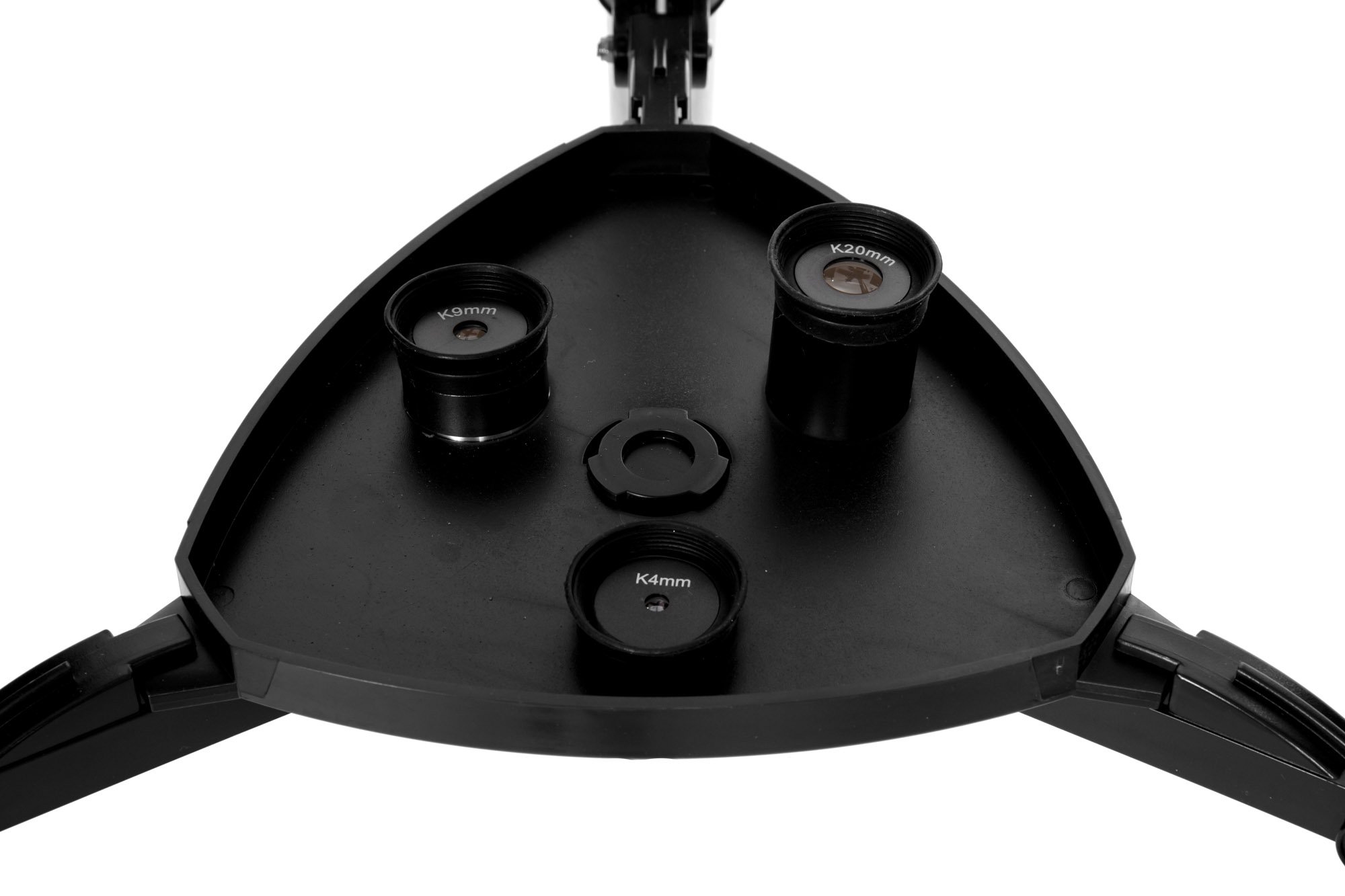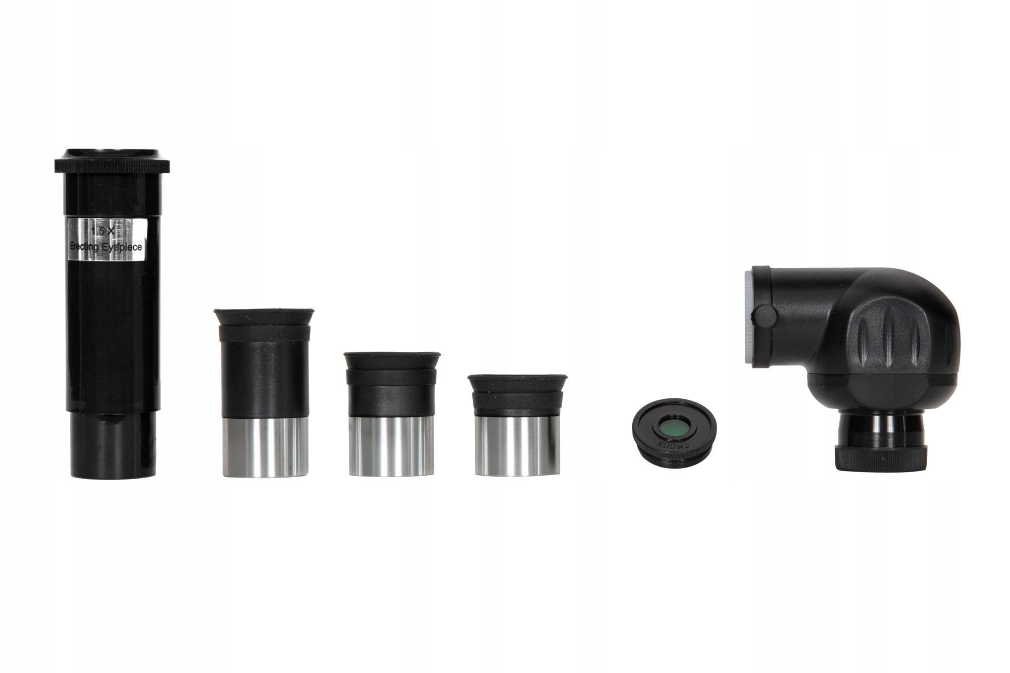 Набір включає три астрономічні окуляри, а також виділений об'єктив Barlow, що дозволяє втричі збільшити діапазон збільшення. Інструмент оснащений таким -клановим Німецька асамблея з паралактичною головкою та точним рухом руху. У поєднанні з прицільним телескопом вони полегшують пошук та відстеження предметів на небі.