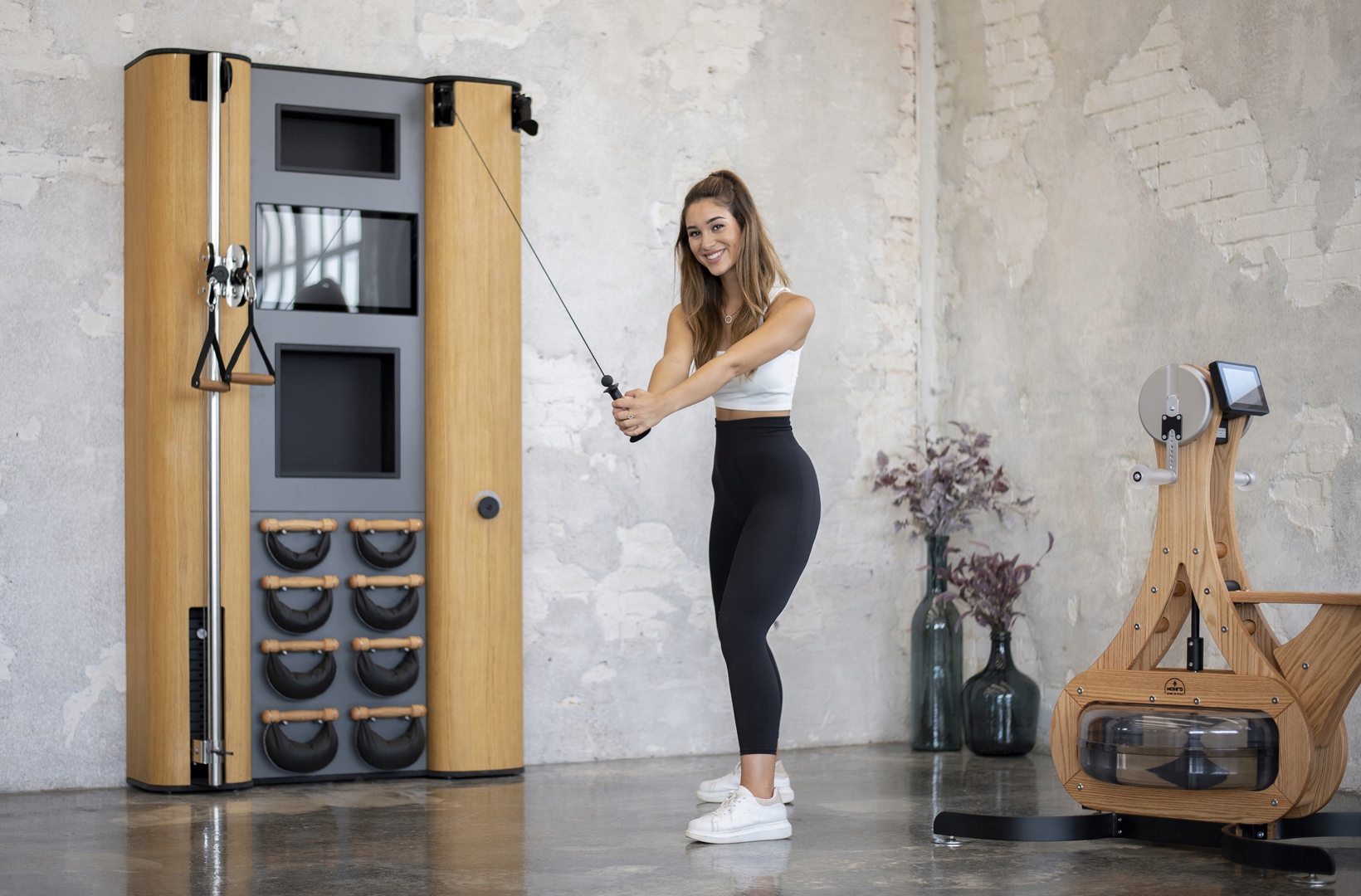 NOHrD Wall Compact пропонує повне тренування всього тіла у сферах сили та витривалості в обмеженому просторі. . Завдяки інтегрованому механізму тяги та тренажеру ви можете тренуватися прямо на стіні NOHrD. Гантелі виготовлені зі зшитої вручну натуральної шкіри, яку можна повісити прямо на стіну після тренування.