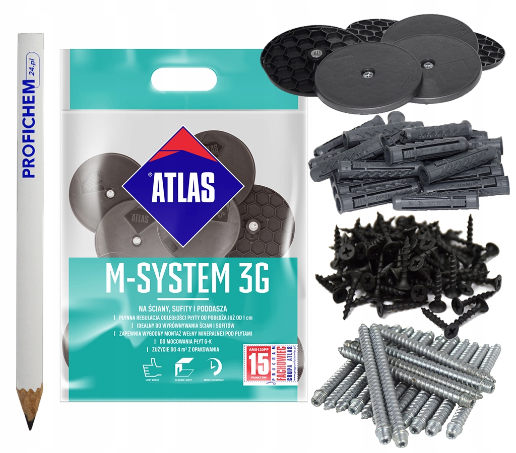 простий в установці - точкове кріплення дозволяє виконувати роботу (встановлення дискових конекторів і облицювальних панелей) одній людині дуже швидкий хід роботи - монтаж повнорозмірної плати обмежується двома етапами: пророблення дюжини отворів, в які потрібно прикріпити роз'єми, і прикручування плати до пластин за допомогою сталевих гвинтів підкладка (як мінеральна, так і дерев'яна) для кріплення системи ATLAS M-3G повинна бути стійкою та несучою. Не потребує підготовчих робіт: вирівнювання, зрізання потрісканих штукатурок, ґрунтування тощо – система дозволяє точно монтувати плити на дуже нерівну або потріскану штукатурку, у місцях дефектів стін тощо. можливість корекції геометрії стін у разі увігнутих або опуклих кутів з кутом, відмінним від 90° - з'єднувачі можна використовувати як додатковий елемент у разі приклеювання гіпсокартону до дуже нерівних поверхонь (>20 мм). Потім їх можна розмістити локально в місцях, де виникають найбільші нерівності, без необхідності виконувати т.зв. наклейки можливість безконфліктного розміщення електричних, водопровідних і каналізаційних установок і вентиляційних каналів під поверхнею облицювання плит - у разі наявних трубопроводів або електропроводки вони дозволяють швидко встановити плити, зберігаючи необхідну стійкість монтажу можливість комбінування ATLAS M-system 3G з: - традиційними технологіями, такими як стелі, оштукатурені гіпсовою штукатуркою, - елементами дворівневих і більше-рівневих стель, змонтованих на основі з'єднувачів 120 PP, 120 ZN або 120 N, - дощок. монтуються на каркасні системи компенсація напруги – завдяки точковому кріпленню окремих дощок; Після заповнення плити утворюють жорсткий щит, що усуває подальші напруги між ними і запобігає утворенню тріщин на стиках; щит відокремлений від обшивки суміжних стін і стелі, що дозволяє йому вільно деформуватися швидкий монтаж елементів корпусу з гіпсокартону - опущені стелі на частині їх поверхонь, елементи корпусу на стінах приміщень і т. д. Їх можна швидко встановити на відведені ділянки стін і стелі, примикаючи до попередньо нанесених штукатурних покриттів, доповнюючи внутрішню обробку. швидкий монтаж підлоги на існуючих поверхах без необхідності проведення демонтажних робіт, уникаючи мокрих етапів роботи та технологічних перерв - без додаткового навантаження на конструкцію стелі можливість зменшення відстані між покриттям і землею до 1 см - що дозволяє мінімізувати втрати об'єму приміщення зручність і безпека при транспортуванні і зберіганні, обмеження вертикального транспортування матеріалів - малі габаритні розміри елементів системи дозволяють транспортувати її легковими автомобілями, що неможливо у випадку стелажних рішень; елементи не блокують простір для зберігання в приміщенні, їх можна зберігати в обмеженому просторі на вулиці або в автомобілі.