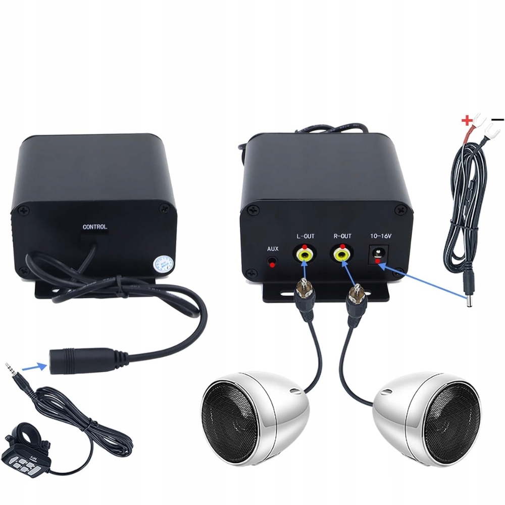 Динаміки оснащені матеріалом ABS, забезпечуючи водостійкість на рівні IP56. Ідеально підходить для використання в дощі та вологих умовах. Варто пам’ятати, однак, що підсилювач не є водонепроникним. установка. Завдяки стандартному джерелі живлення 12В, збірка швидка і проста. Набір включає провідний пульт дистанційного керування, який дозволяє легко керувати звуком. Підходить до керма діаметром від 1 до 1,5 дюйма, що робить його ідеальним для мотоциклів, ATV, UTV, RZR та інших транспортних засобів.