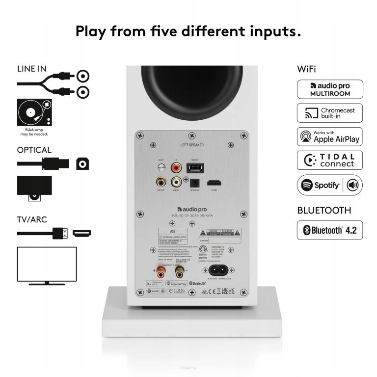 Модель A38 сумісна з багатокімнатною системою Audio Pro, що дозволяє їй працювати в одній зоні звукової системи з іншими динаміками шведського виробника, які підтримують це рішення. це ще не все! Завдяки сумісності з Google Cast і AirPlay 2 ви можете використовувати потокові сервіси, такі як Amazon Music, Deezer, iHeart Radio, Napster, Qobuz, QQ Music, Spotify, Tidal, TuneIn, vTuner і багато інших.