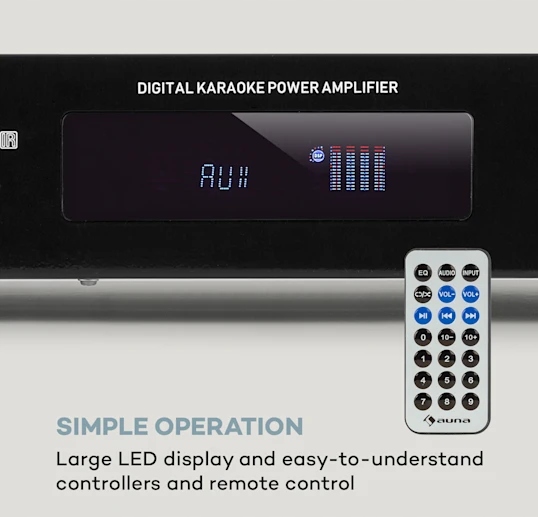 Цифровий підсилювач auna AMP-9200 BT з інтерфейсом Bluetooth забезпечує зручне бездротове відтворення всього аудіо файли зі смартфона, планшета чи ноутбука в межах 20 метрів. Підсилювач отримує додатковий аудіовхід або через гніздоAUXвідCDплеєра або стереосистеми, черезвхід DVD через порт USB або слот SDз носіїв мас. Два входи для переднього мікрофона роблять підсилювач повноцінним пристроєм для караоке, який стане в нагоді на вашій наступній домашній вечірці з сім'єю та друзями. Як зазвичай у випадку з підсилювачами, високі частоти, низькі частоти та баланс можна вільно регулювати. Повністю налаштований аудіосигнал виводиться із задньої панелі в стереопростір. Кожен із двох стереороз’ємів для роз’ємів типу «банан» або роз’ємів забезпечує потужність 60 Вт RMS. Крім того, ви також можете використовувати вихід диктофона для запису караоке. Компактний і простий дизайн цифрового стереопідсилювача доповнюється елегантною чорною передньою панеллю з великим світлодіодним дисплеєм і сріблястими ручками.