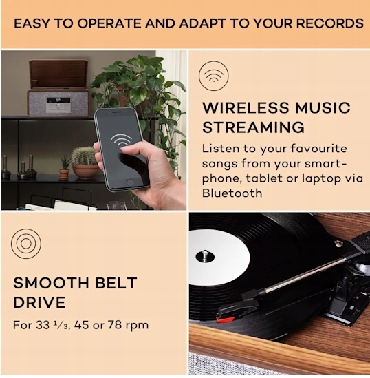 - Програвач зі швидкістю відтворення дисків 33 ⅓ / 45 / 78 об/хв